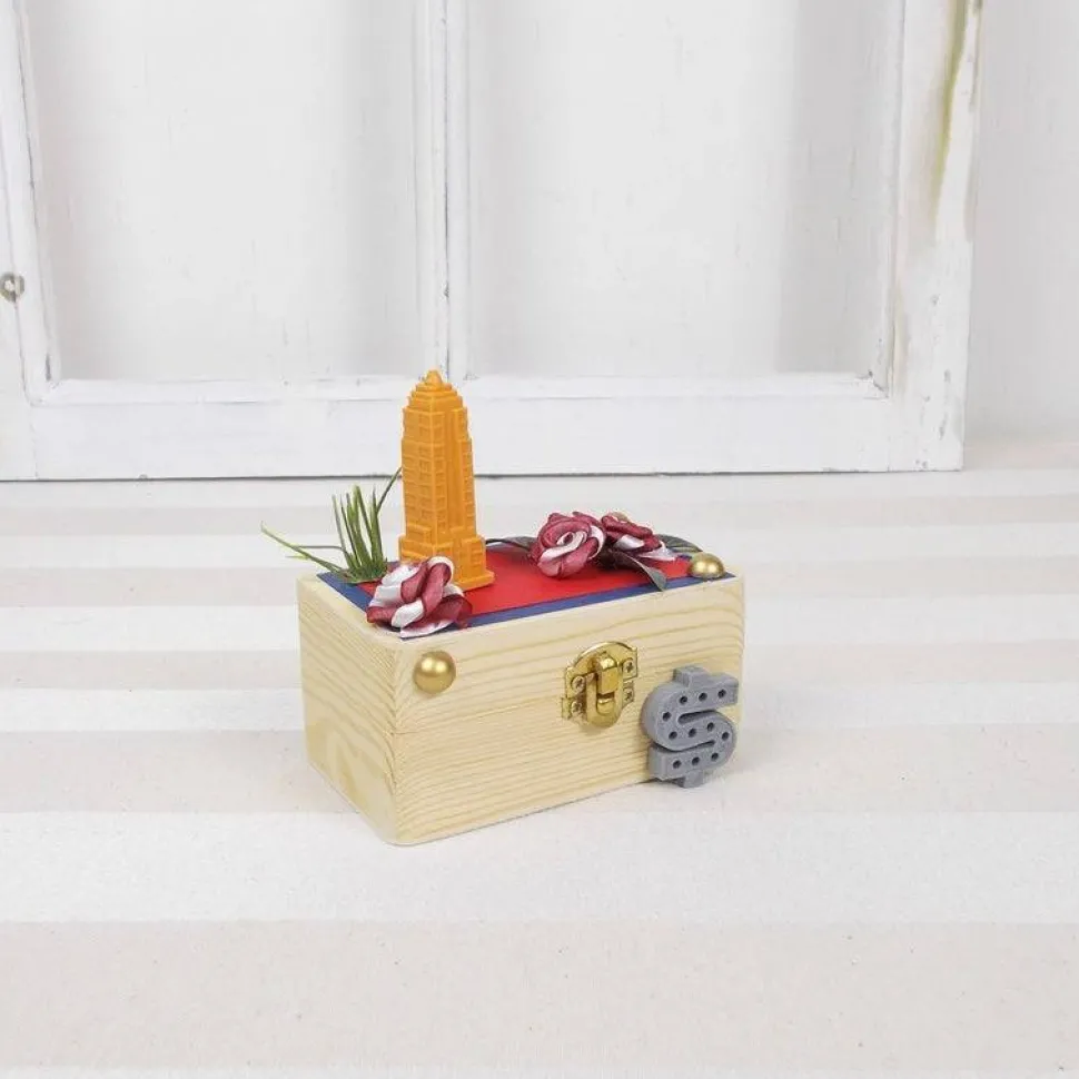 Auf der hübschen Holzschatulle haben wir einige Dekorationen zum Thema USA arrangiert, z.B. das Empire State Building und schöne kleine Blüten.