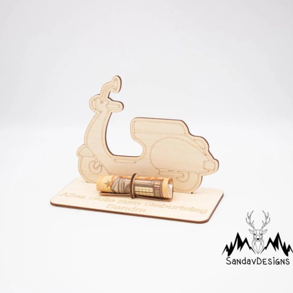 Unser Geldgeschenk aus 3 mm Birkensperrholz bietet nicht nur eine stilvolle Präsentation für Geldscheine, sondern kann auch als dekoratives Element in jedem Zuhause dienen. Es kann an der Wand aufgehängt oder auf einem Regal platziert werden, um eine wunderbare Erinnerung an den besonderen Anlass zu schaffen.