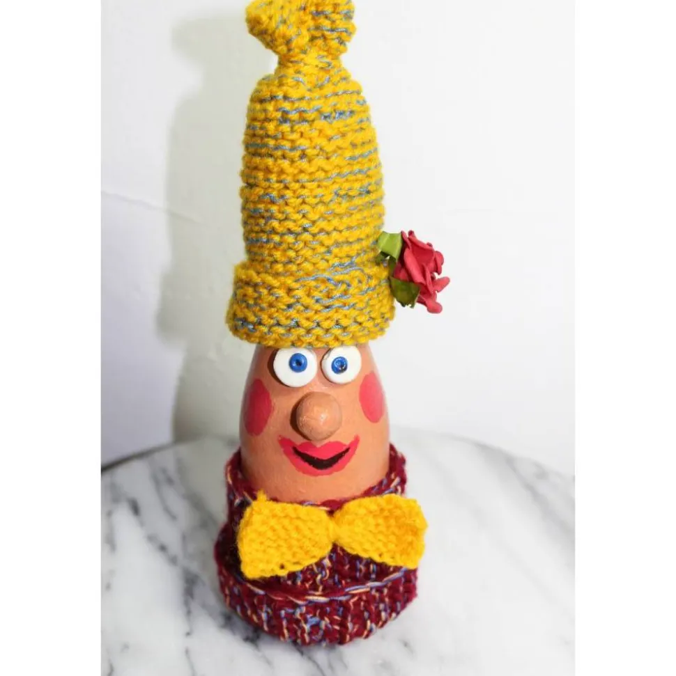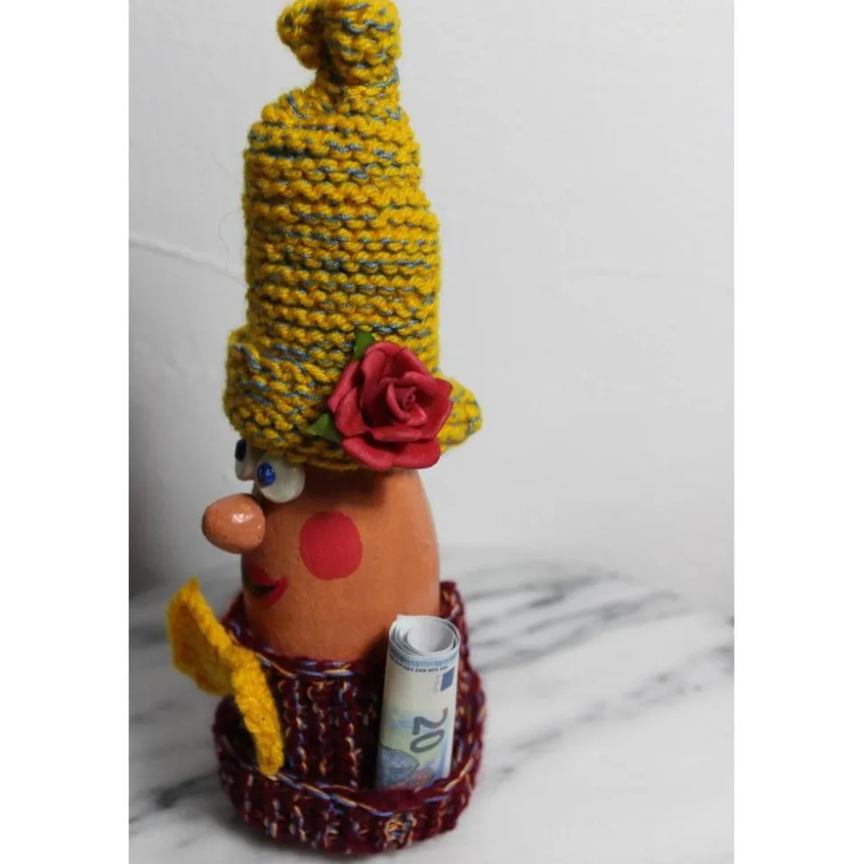 Witzige Figur aus einer Glasflasche. Upcycling-Projekt, gestaltet mit Acrylfarbe und handgestrickten Accessoires. Am Wollmützchen sind künstliche Blüten befestigt. Kann als Geldgeschenk verwendet werden, indem man einen Geldschein seitlich einsteckt :), siehe Beispielfoto.