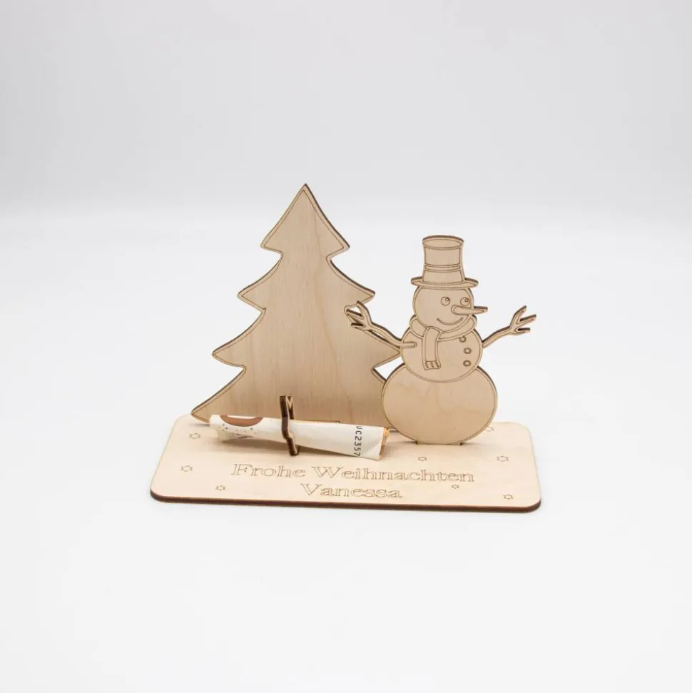 Geldgeschenk Schneemann mit Tannenbaum – aus Holz personalisiert
