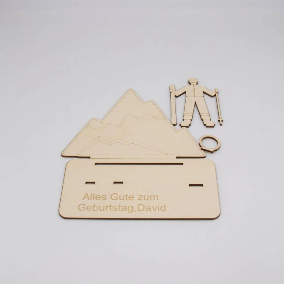 Das Motiv, ein elegante/-r Skifahrer/-in, vor einer atemberaubenden Bergkulisse. Es ist mit höchster Präzision mittels Laserschnitttechnik erstellt. Die feinen Details im Holz fangen die Dynamik des Skifahrens und die Majestät der Berge auf faszinierende Weise ein.