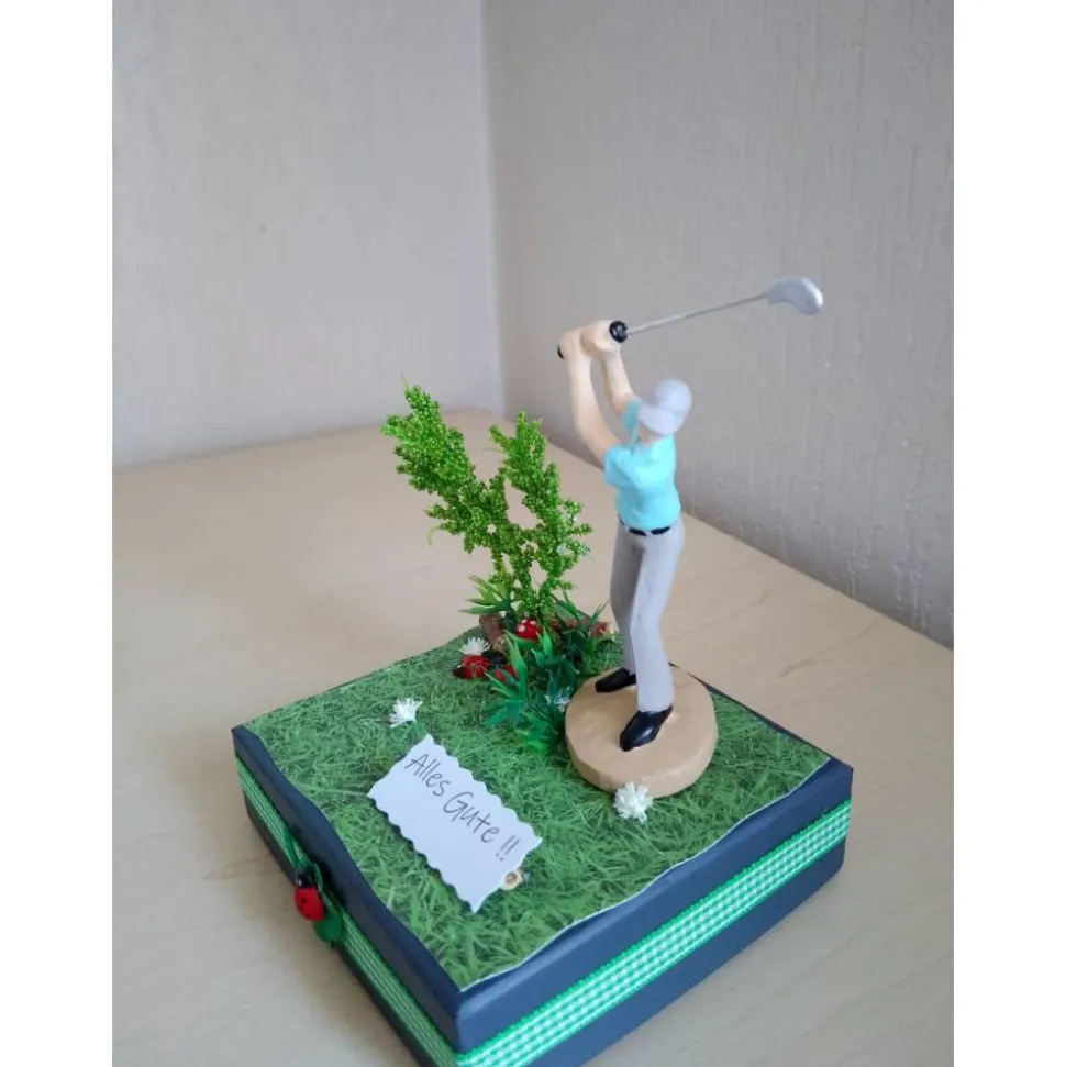 Überrasche einen Sportler, Golfer mit einem einzigartigen Geldgeschenk! Diese dekorative Geschenkbox ist perfekt für Männer, die gerne in der Natur aktiv sind. Die Box ist liebevoll mit einer Männerfigur beim Laufen, Joggen sowie mit Naturdeko und Grasbüscheln gestaltet und setzt den sportlichen Lifestyle gekonnt in Szene.