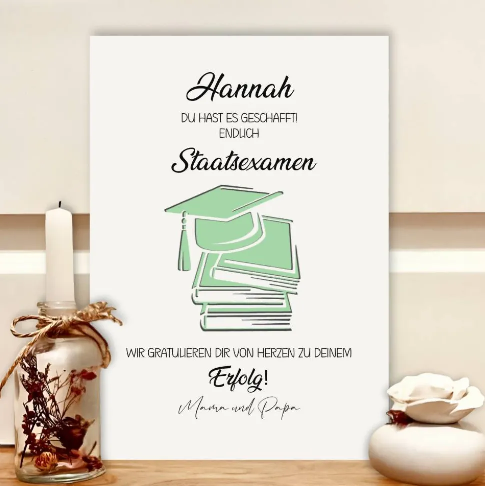 Dieses Geschenkbild ist eine stilvolle und bedeutungsvolle Geschenkidee für Absolvent:innen. Es bleibt als dekoratives Element lange in Erinnerung und wird zum Symbol des erreichten Meilensteins.