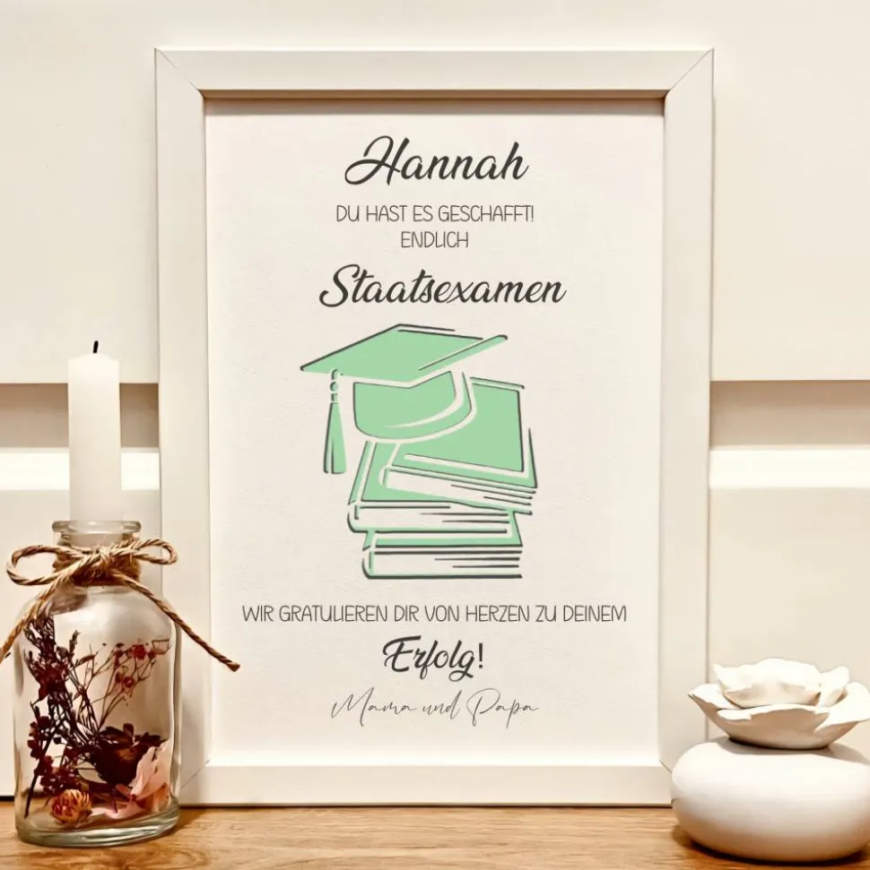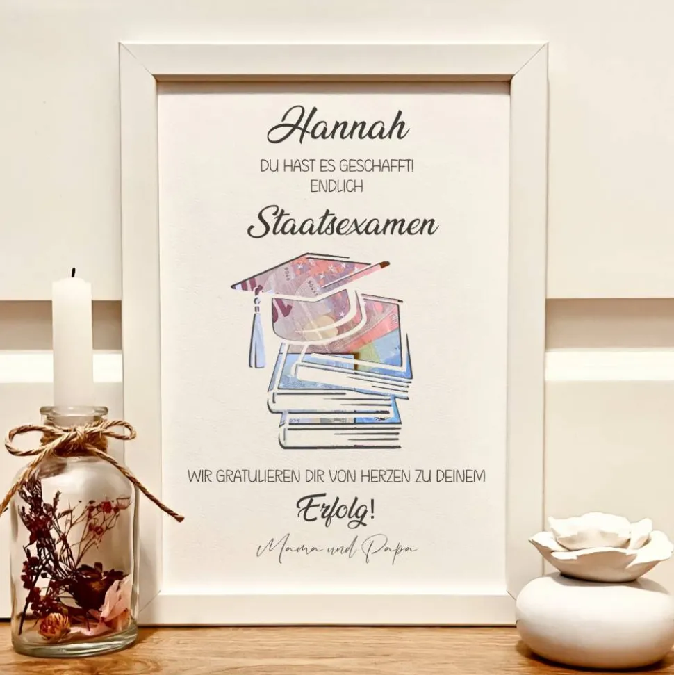 Du suchst ein besonderes Geschenk zum bestandenen Staatsexamen, Bachelor, Abitur, Master, Doktor oder zur abgeschlossenen Ausbildung? Mit unserem exklusiven Geschenkrahmen verbindest du Geldgeschenk und bleibende Erinnerung auf kreative Weise.