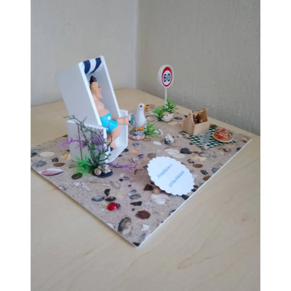 Verschenke ein außergewöhnliches Geldgeschenk zum runden Geburtstag und überrasche den Mann mit einer einzigartigen Strandszene! Die Malkarton-Unterlage ist mit Sand-Muschelpapier beklebt und bildet die perfekte Basis für dieses originelle Präsent.