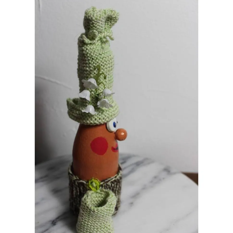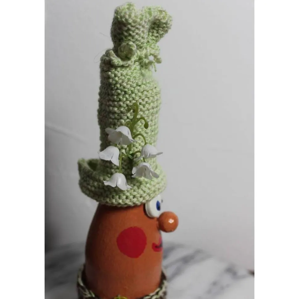 Witzige Figur aus einer Glasflasche. Upcycling-Projekt, gestaltet mit Acrylfarbe und handgestrickten Accessoires. Am Wollmützchen sind künstliche Blüten befestigt. Kann als Geldgeschenk verwendet werden, indem man einen Geldschein seitlich einsteckt :), siehe Beispielfoto.