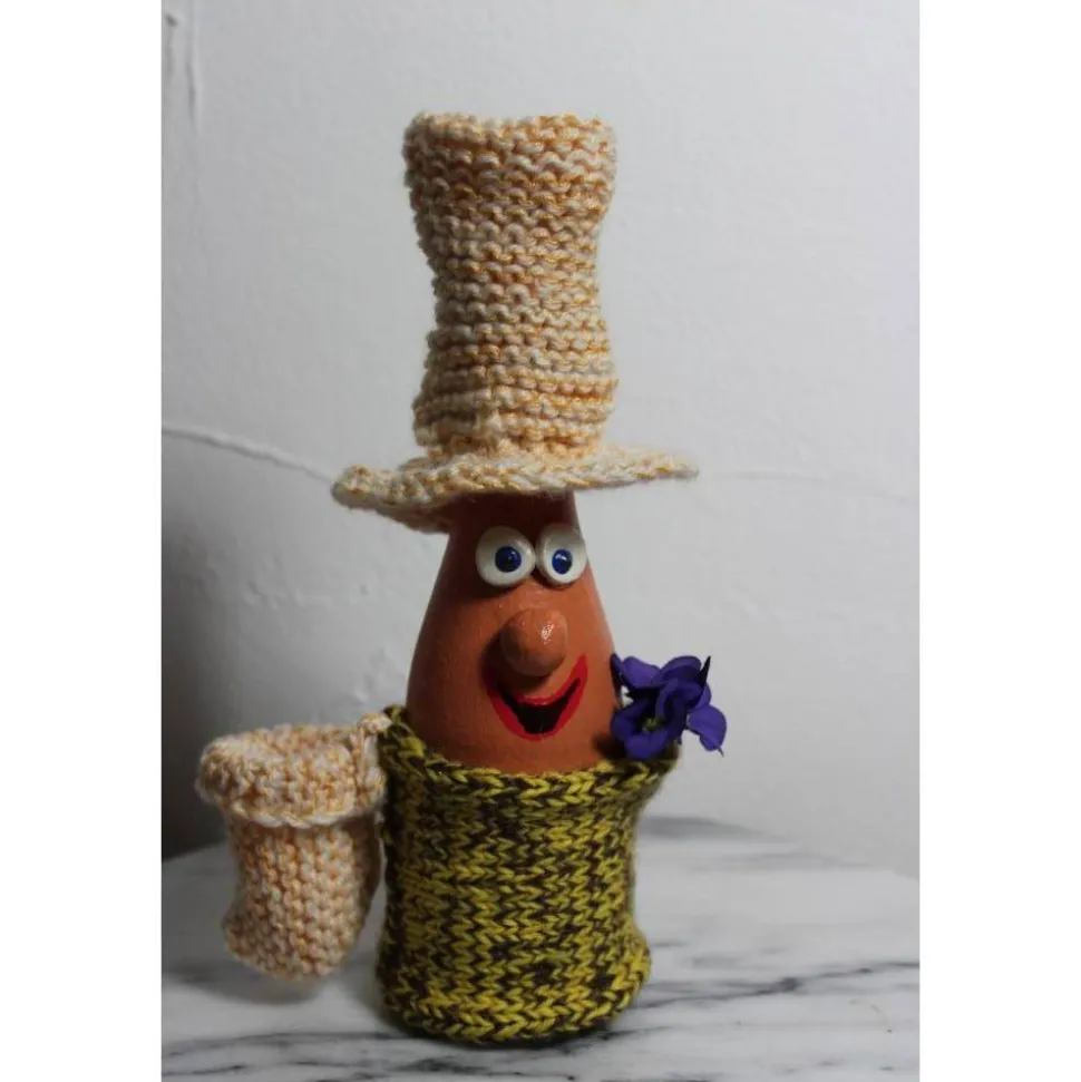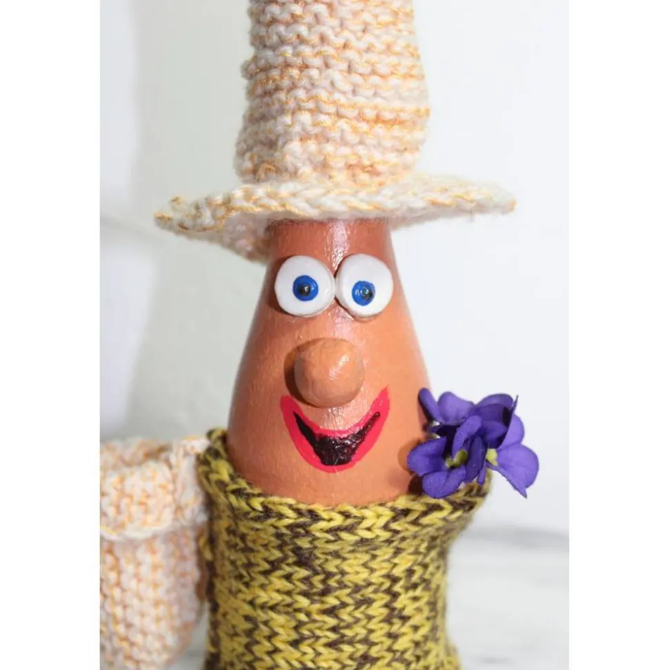 Witzige Figur aus einer Glasflasche. Upcycling-Projekt, gestaltet mit Acrylfarbe und handgestrickten Accessoires. An der Bauchbinde ist eine künstliche Blüte befestigt. Kann als Geldgeschenk verwendet werden, indem man einen Geldschein/Gutschein seitlich in das Täschchen einsteckt :), siehe Beispielfoto.