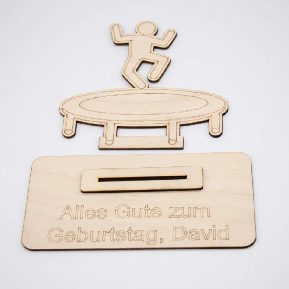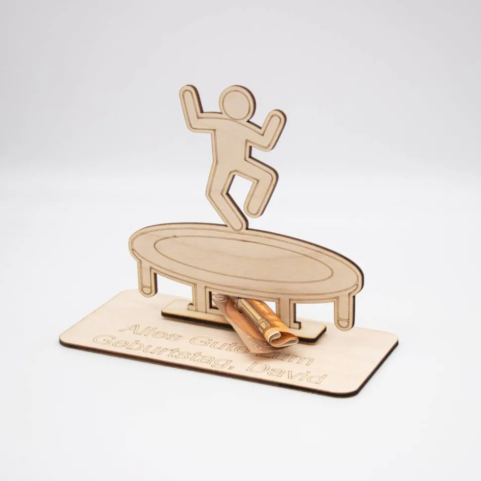 Unser Geldgeschenk aus 3 mm Birkensperrholz bietet nicht nur eine stilvolle Präsentation für Geldscheine, sondern kann auch als dekoratives Element in jedem Zuhause dienen. Es kann an der Wand aufgehängt oder auf einem Regal platziert werden, um eine wunderbare Erinnerung an den besonderen Anlass zu schaffen.