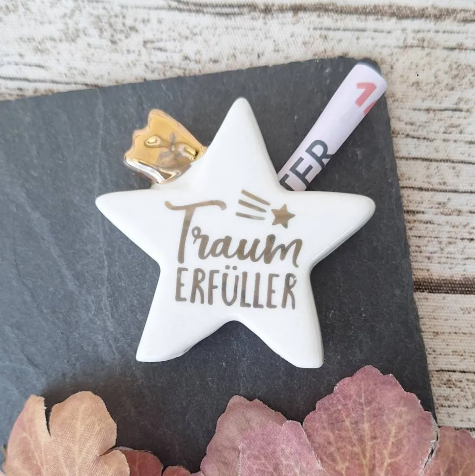 Der niedliche Porzellan-Stern ist mit goldfarbener Schrift bedruckt und bietet Platz für einen gerollten Geldschein. Geliefert wird er in einer goldenen Geschenkverpackung.
