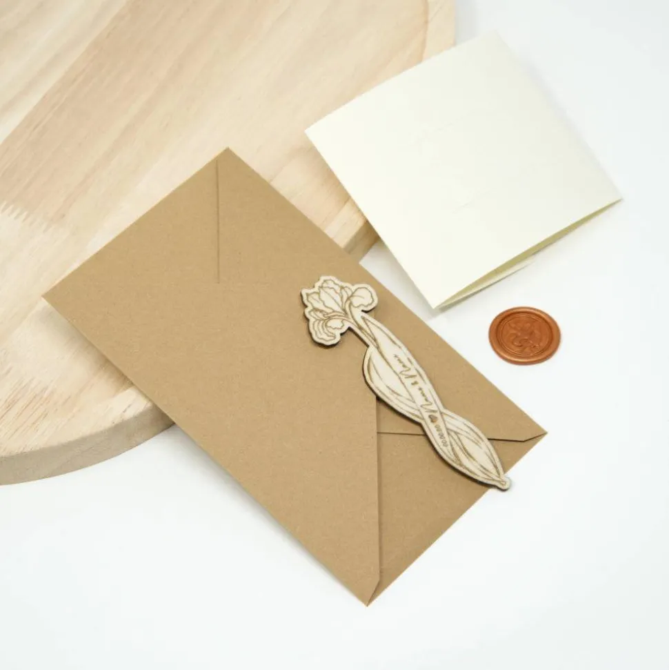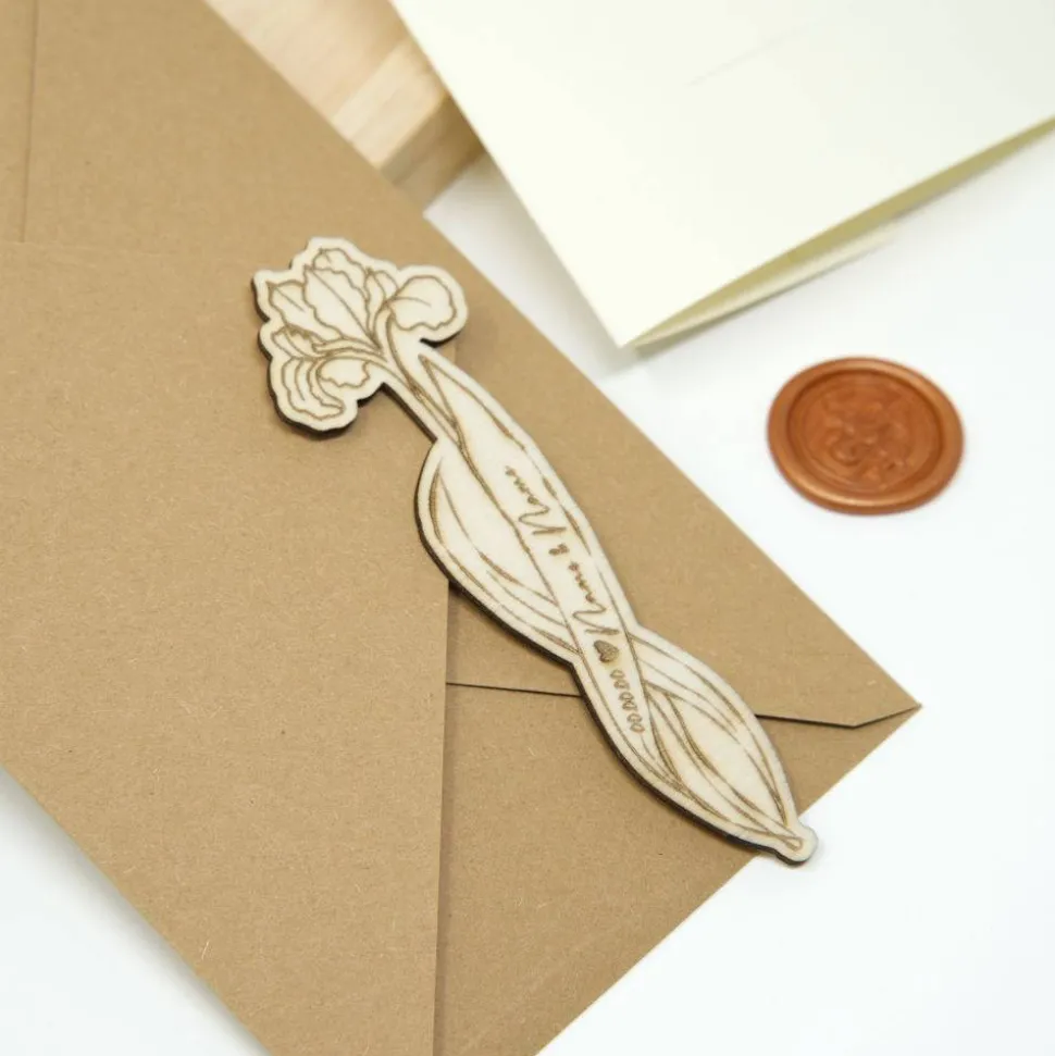 Die Holzblume kann später als Deko oder als Lesezeichen genutzt werden. Die Farbe des Wachssiegel (rötlich braune Farbnuancen) erfolgt per Zufall.