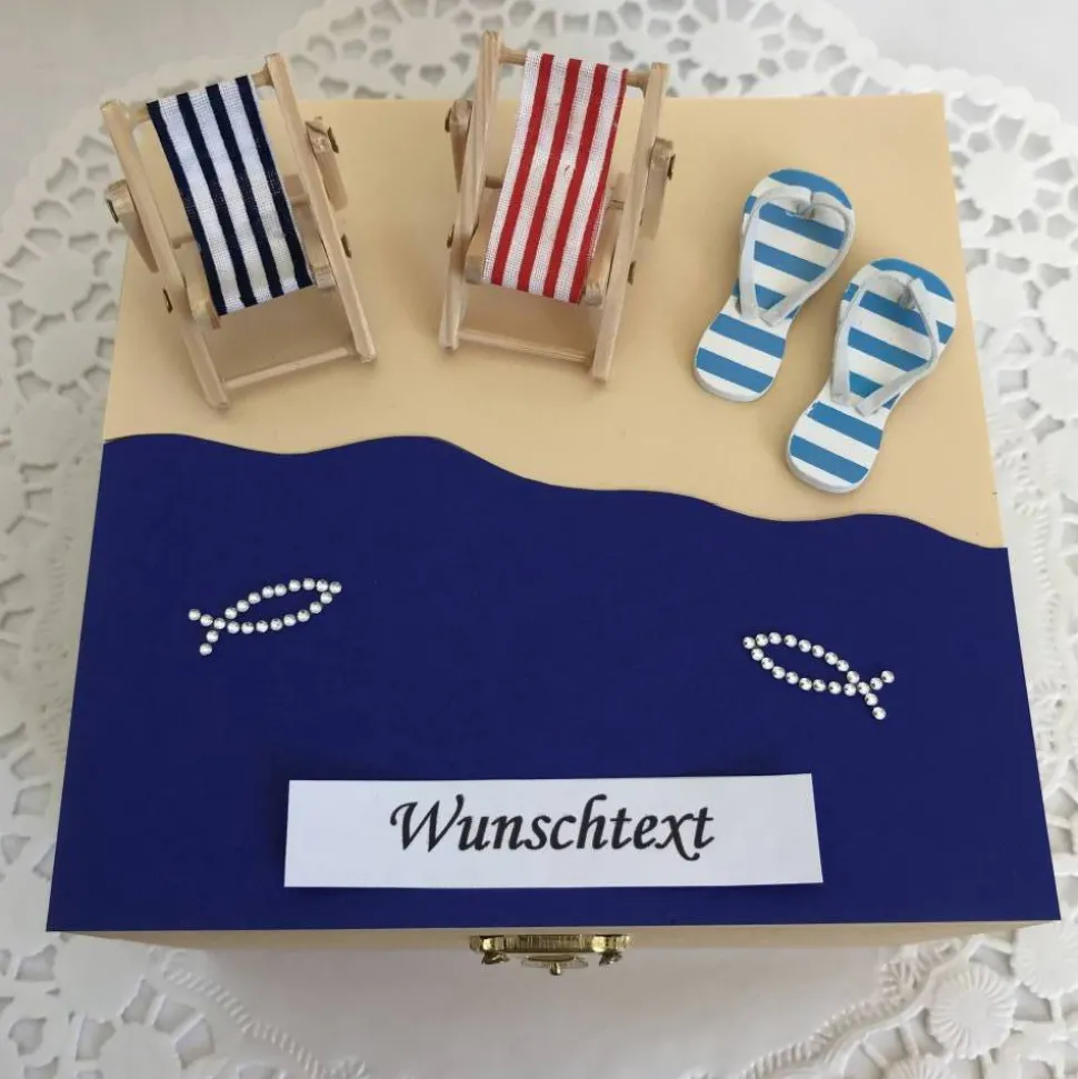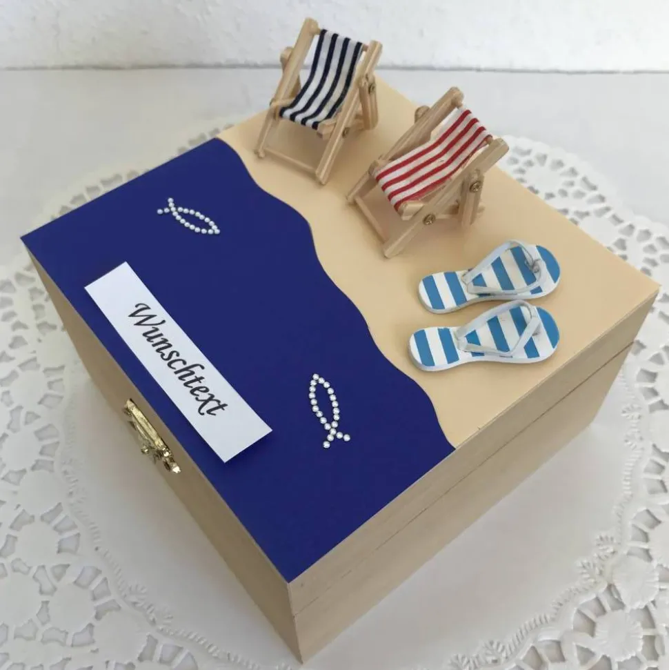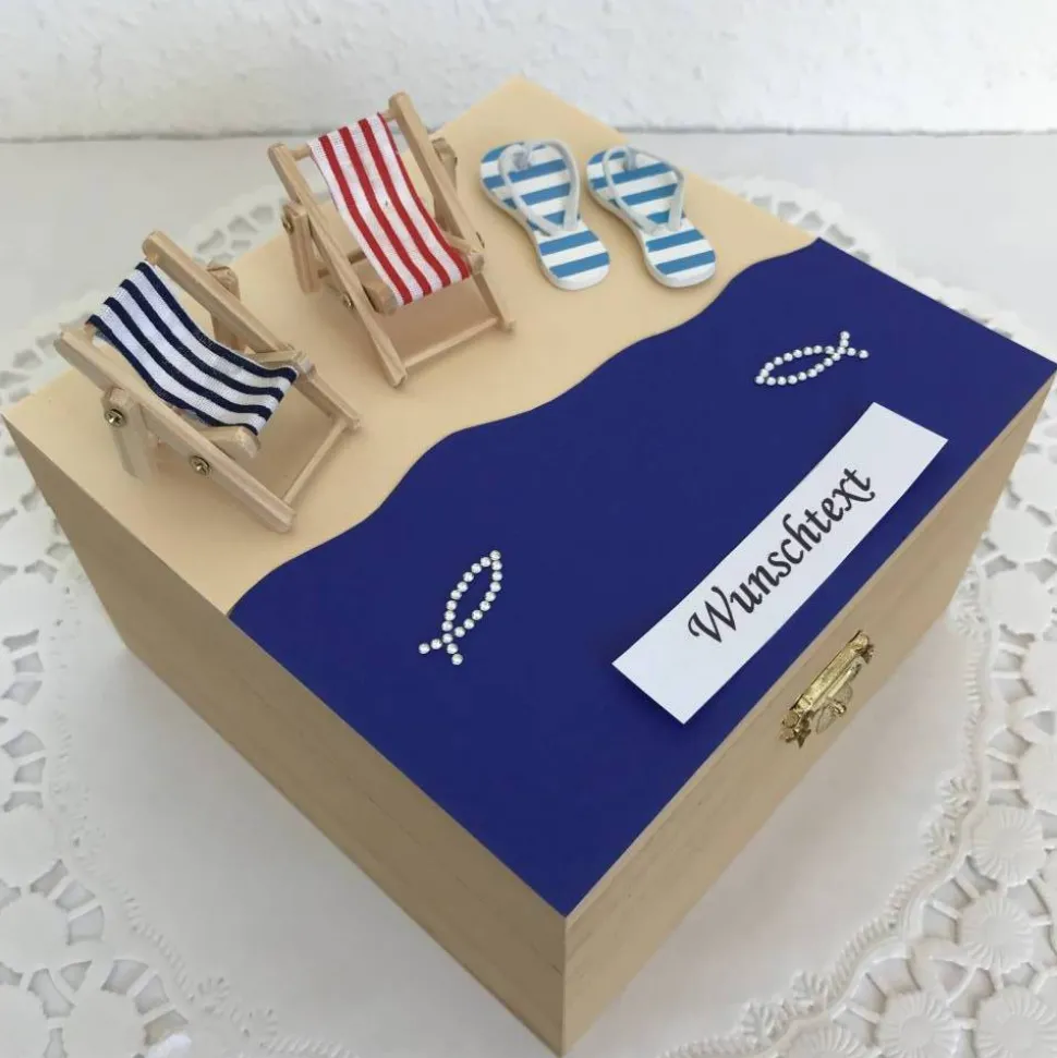 Ob zum Geburtstag, zur Hochzeit, für ein Wellness-Wochenende oder für jeden anderen Anlass – dieses Geldgeschenk ist ein echter Blickfang. Die liebevoll gestaltete Strand-Meer-Szene mit Sand, Wasser, Flip-Flops, Liegestühlen und glitzernden Fischen lässt Männer wie Frauen vom Urlaub, den Flitterwochen oder einem tollen Wellness-Tag träumen. Das Geld kann ebenso wie ein Gutschein problemlos im Inneren der Holz-Box verstaut werden. Mit diesem wundervollen Geldgeschenk macht das Geld verschenken Freude! Und das Beste: selbst dein Wunschtext findet seinen Platz.