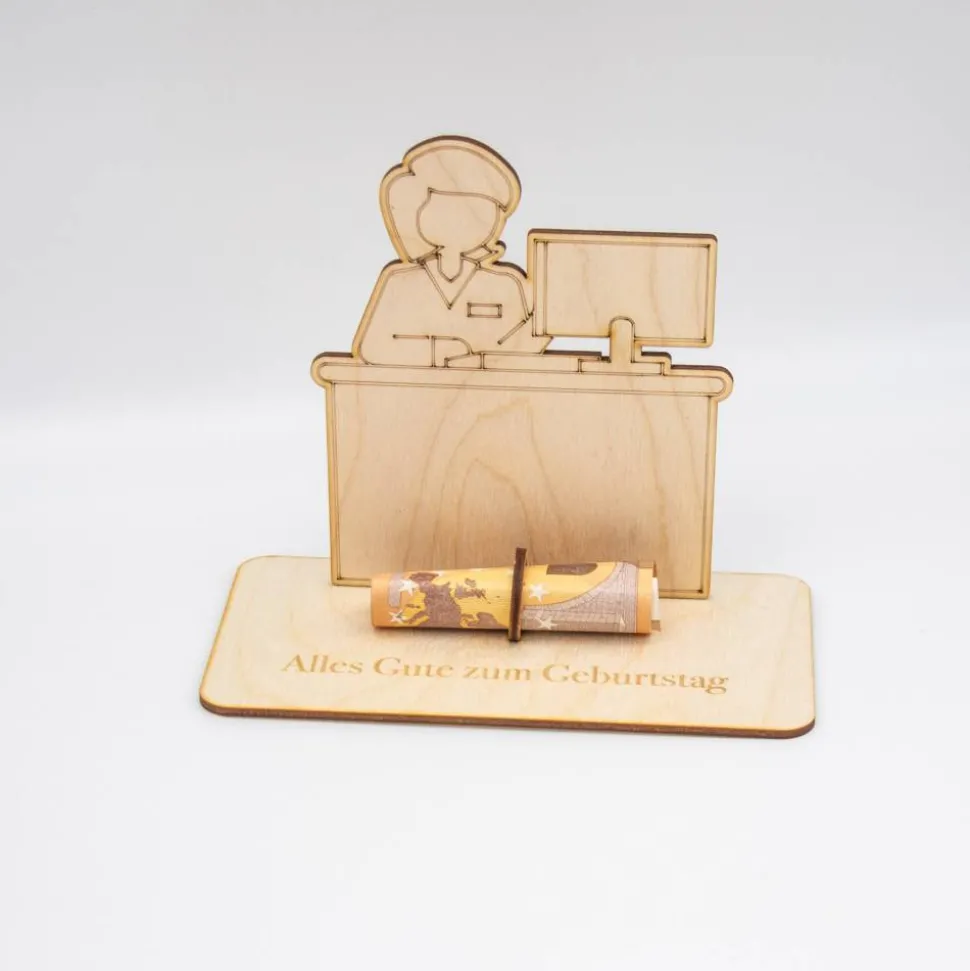 Verleihen Sie Ihrem Geldgeschenk eine besondere Note mit unserem exquisiten Präsent aus 3 mm starkem Birkenholz. Das charmante Motiv einer freundlichen Verkäuferin, die hinter einer detailreichen Ladentheke steht, bringt ein Lächeln auf das Gesicht des Beschenkten.