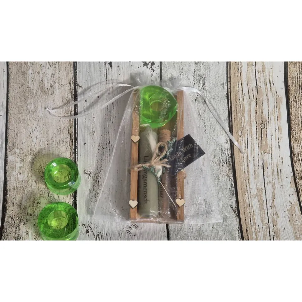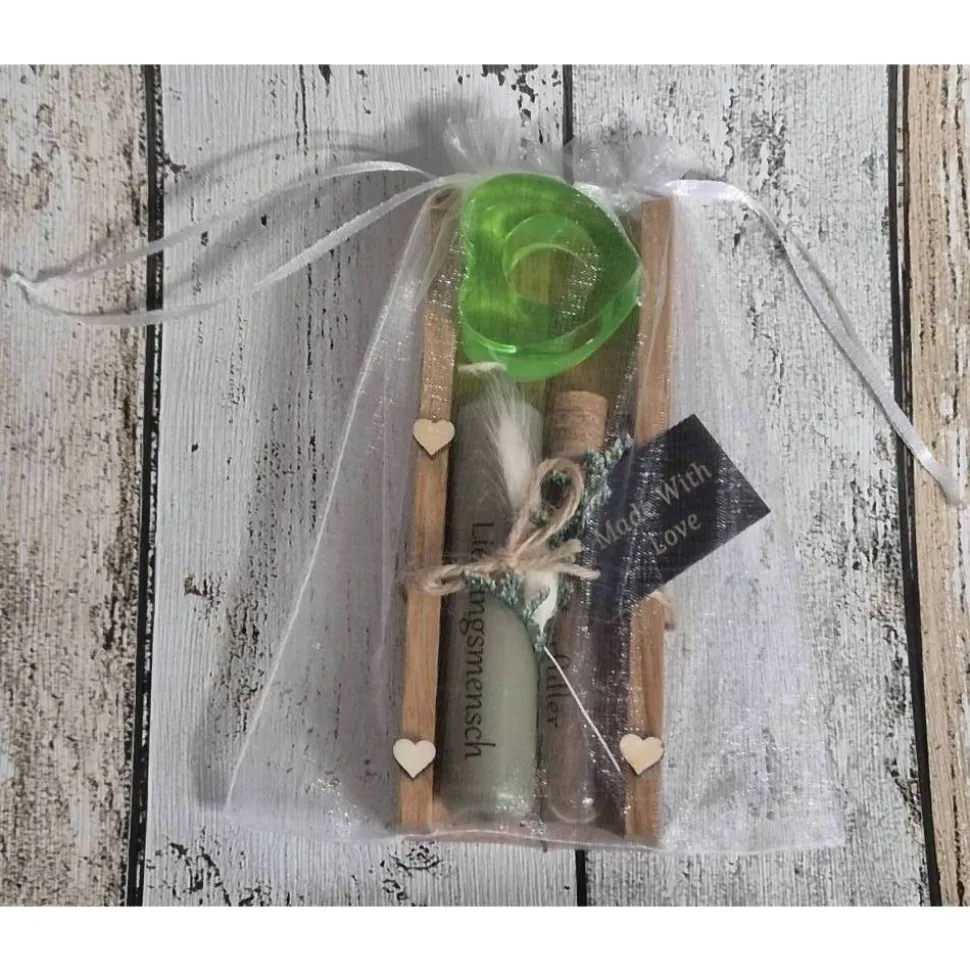 Abgerundet wird das Set durch eine hübsche Kordel, eine stilvolle Trockenblume (von mir passend ausgewählt, kann vom Bild abweichen), ein liebevolles Etikett sowie ein elegantes Organzasäckchen in Weiß. So entsteht ein rundum gelungenes, individuelles Geschenk, das garantiert Eindruck macht.
