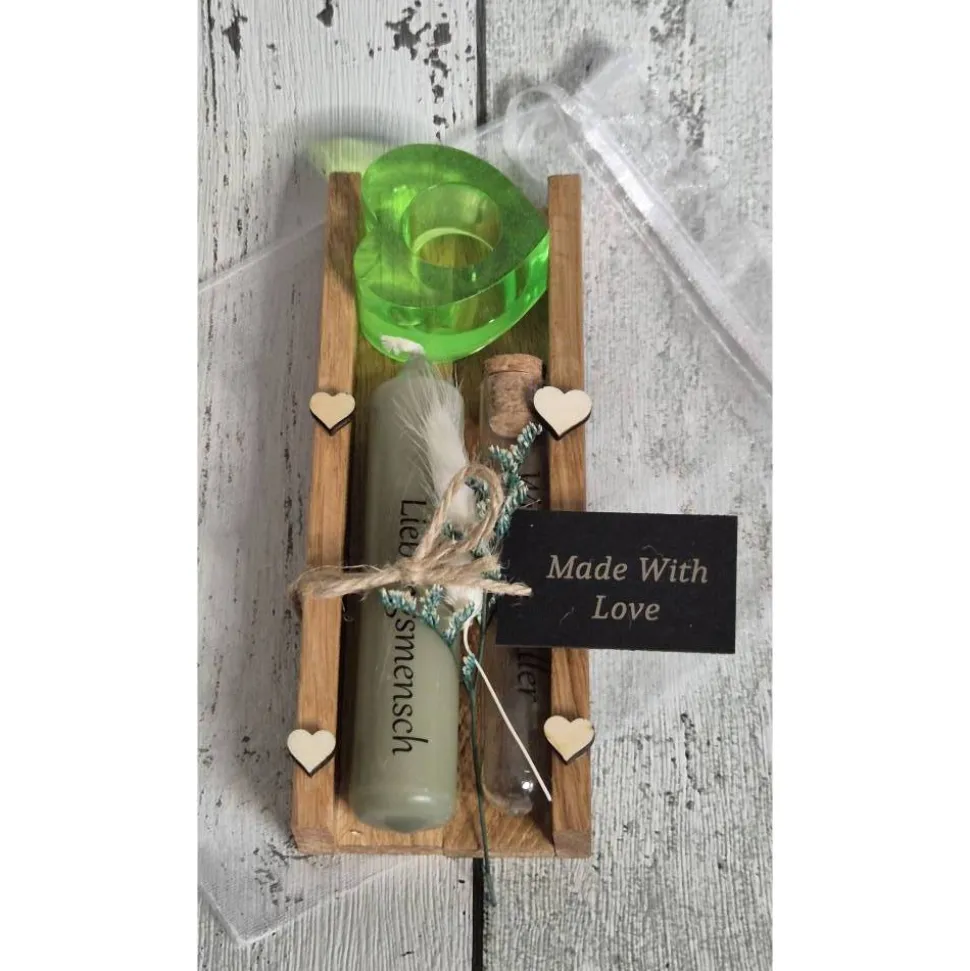 Die enthaltene Kerze in staubig grün (11cm) wird individuell mit einer Aufschrift deiner Wahl verziert, sodass du ein ganz persönliches Geschenk überreichst. Das Reagenzglas aus Kunststoff mit Korken (10cm) trägt die Aufschrift „Wunscherfüller“ und bietet Platz für einen Geldschein als kreative Überraschung.