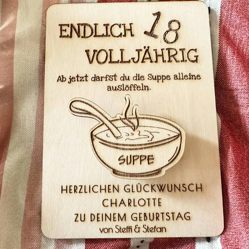 Ich gebe mir sehr viel Mühe bei der Herstellung deines Produktes, beachte jedoch, dass Holz ein Naturprodukt ist und es deshalb zu Abweichungen in Maserung, Farbe, Struktur oder Materialdicke kommen kann, auch Asteinschlüsse lassen sich nicht immer vermeiden. Je nach Beschaffenheit des Holzes kann die Gravierung unterschiedlich kräftig ausfallen, auch Schmauchspuren an Schnittkanten lassen sich leider nicht immer vermeiden. Dies ist somit kein Grund zur Beanstandung. Die Bilder dienen als Beispielbilder, auch Einstellungen des Bildschirmschirms können das Produkt anders wirken lassen.