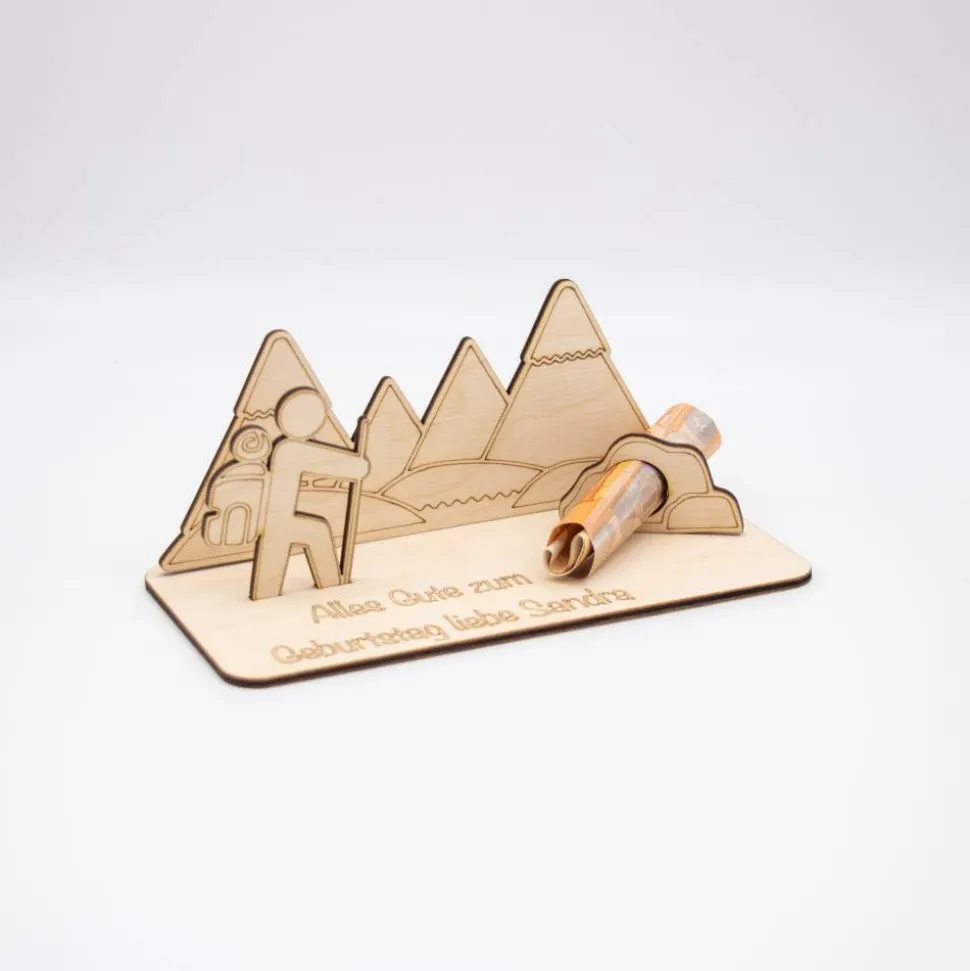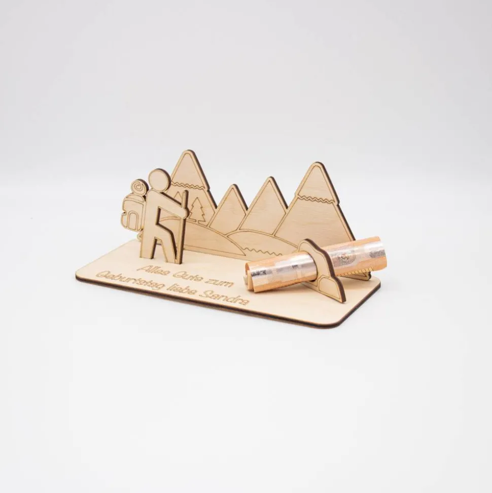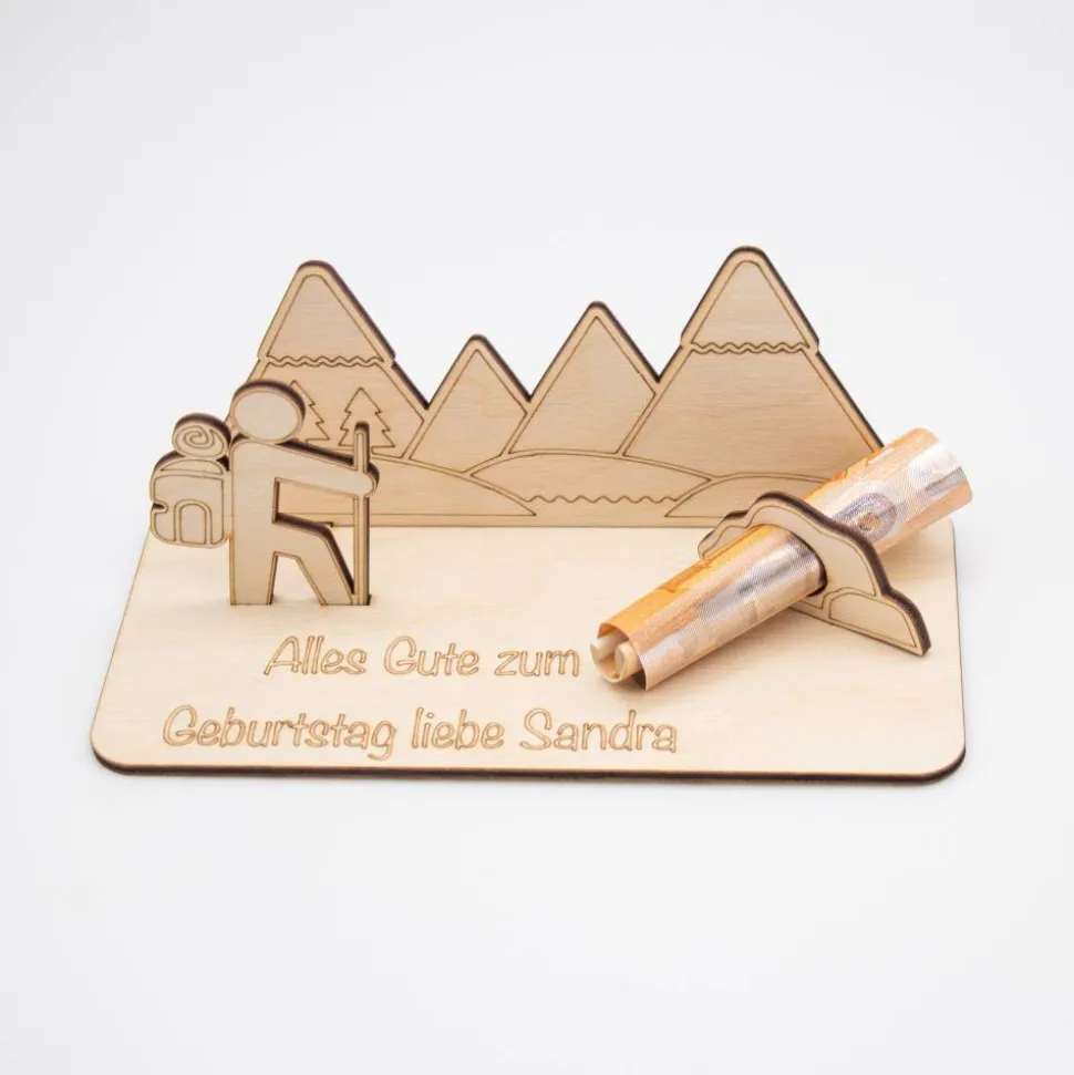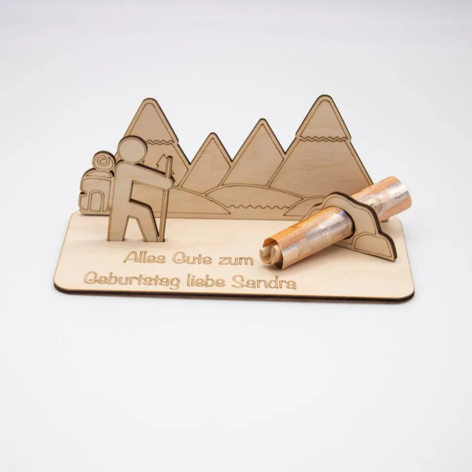 Mache dein Geschenk unvergesslich – wähle unser Holz Geldgeschenk mit Wander- und Bergmotiv, das ebenso einzigartig ist wie der Empfänger selbst!