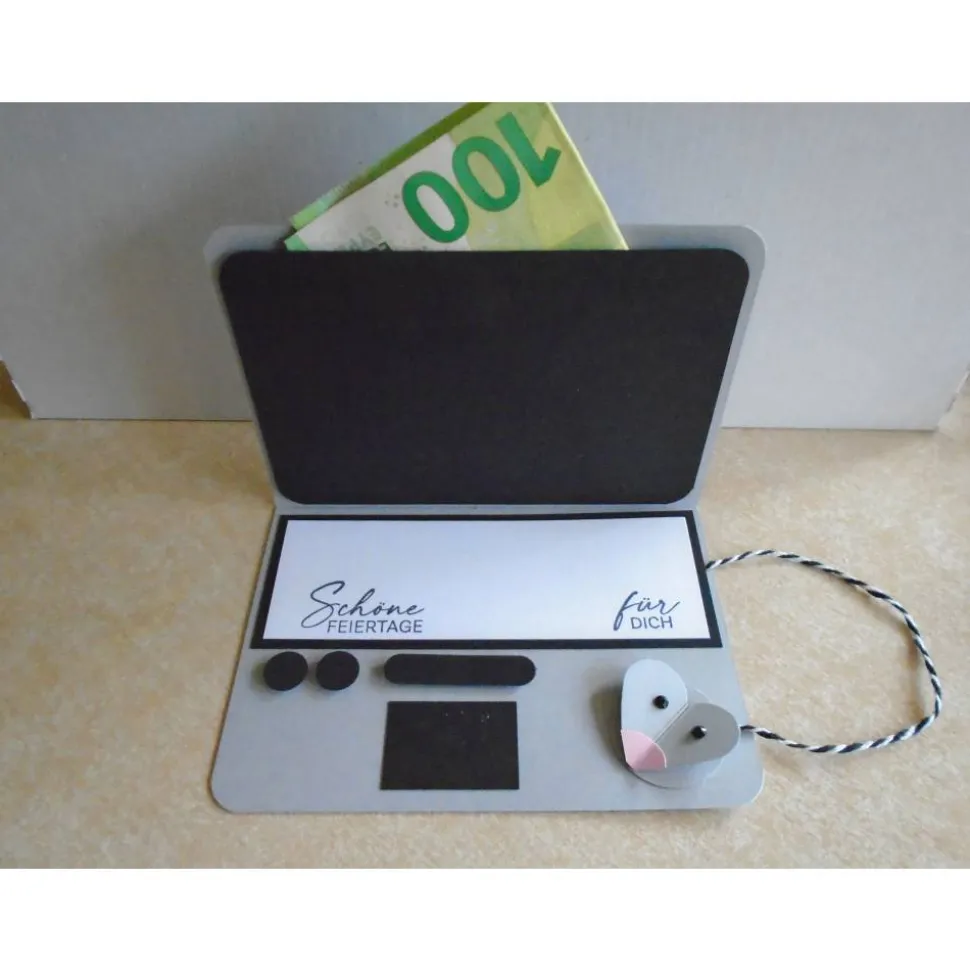 Verziert wurde diese Laptopkarte Gutschein Geldgeschenk zu Weihnachten mit Geldfach und Maus…