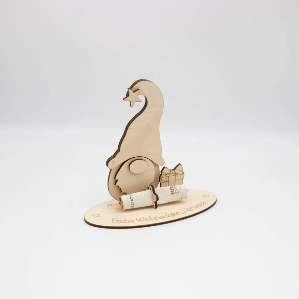 Verleihen Sie Ihren Weihnachtsgeschenken eine persönliche und charmante Note mit unserem handgefertigten Holz-Geldgeschenk, verziert mit einem entzückenden Weihnachtswichtel! Dieses einzigartige Geschenk ist aus 3mm dickem Birkensperrholz mit größter Sorgfalt und Präzision laser geschnitten, was ihm eine exklusive und detaillierte Optik verleiht.