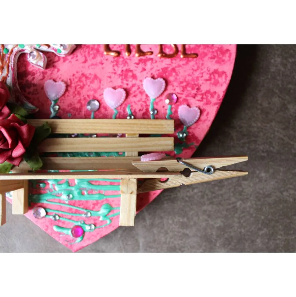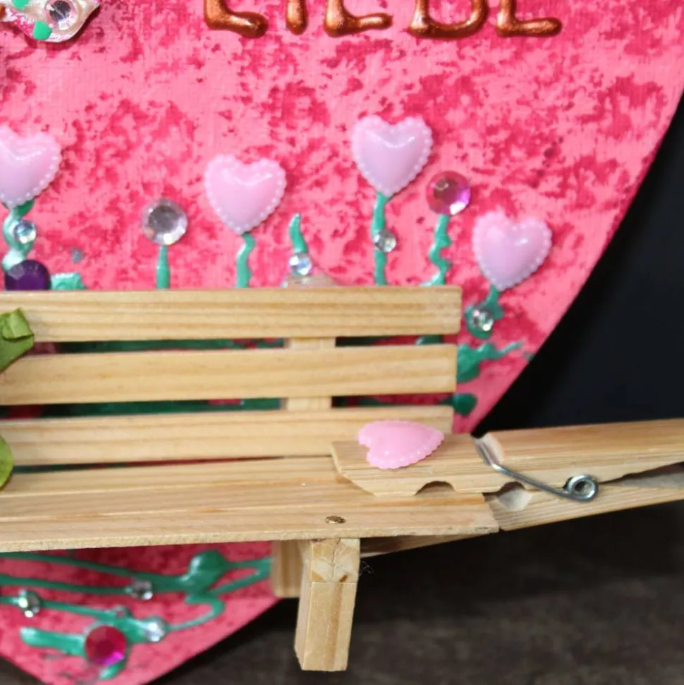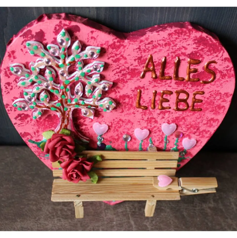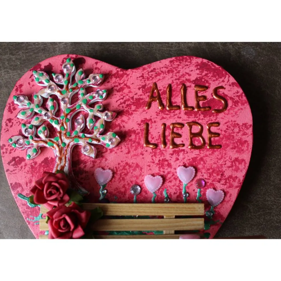 Dekoriert mit Holzornamenten, Acrylfarben und Kunstblumen.