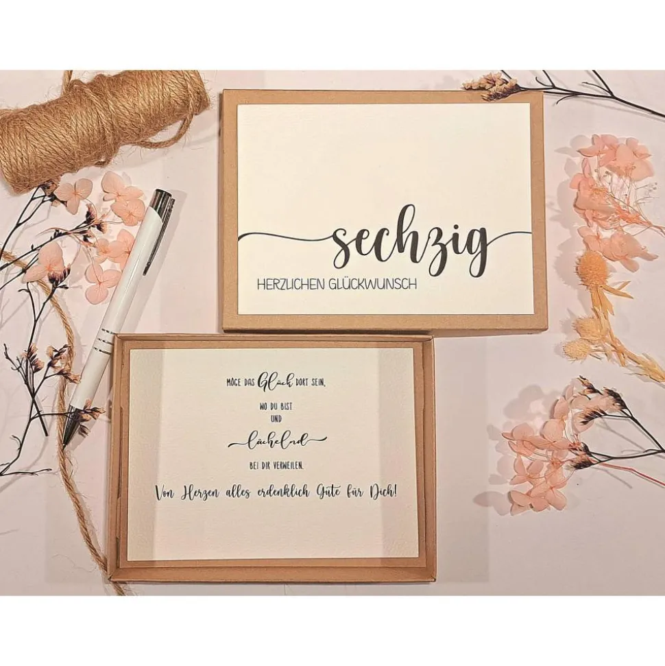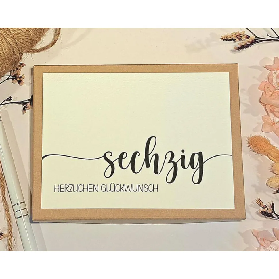 Überrasche zum 60. Geburtstag mit einer einzigartigen Geschenkidee! Diese hochwertige Geschenkbox aus Kraftkarton ist mit dem stilvollen und minimalistischen Schriftzug „sechzig“ verziert – perfekt, um dein Geldgeschenk edel zu verpacken.