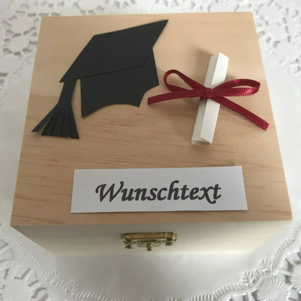 Dekoriert ist die Holz-Box mit Doktorhut sowie Abschluss-Zeugnis. Farblich sowohl für den Mann als auch die Frau geeignet. In der praktischen Schatulle aus Holz lässt sich ein Gutschein ebenso als Geschenk überreichen wie Geld in Münzen oder Scheinen. Besonderes Highlight ist das Schild mit Wunschtext wodurch das Geldgeschenk noch persönlicher gestaltet werden kann.
