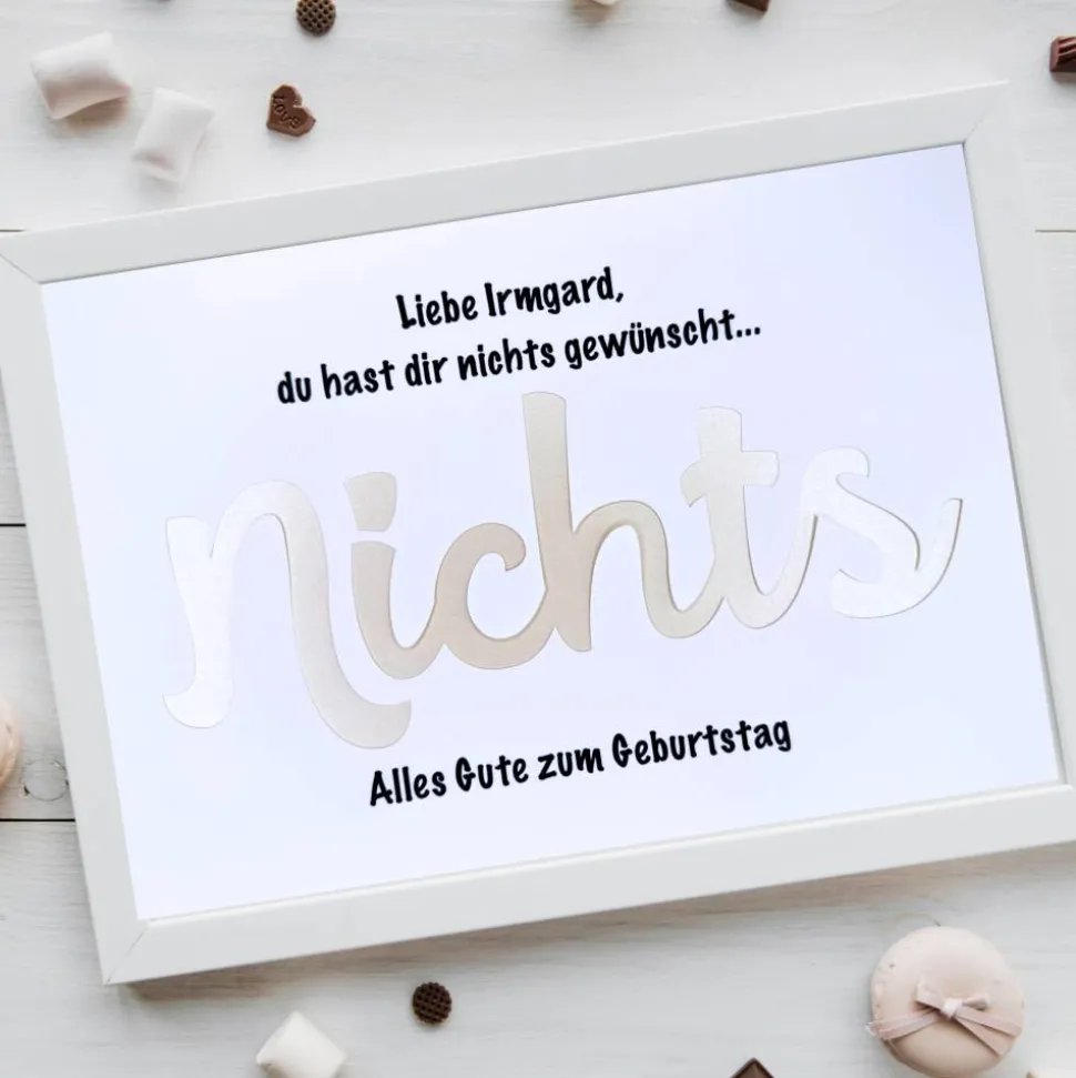 Das ausgeschnittene „Nichts“-Motiv ermöglicht es, Geldscheine dekorativ dahinter zu platzieren. Nach der Entnahme bleibt das edle Hintergrundpapier sichtbar.