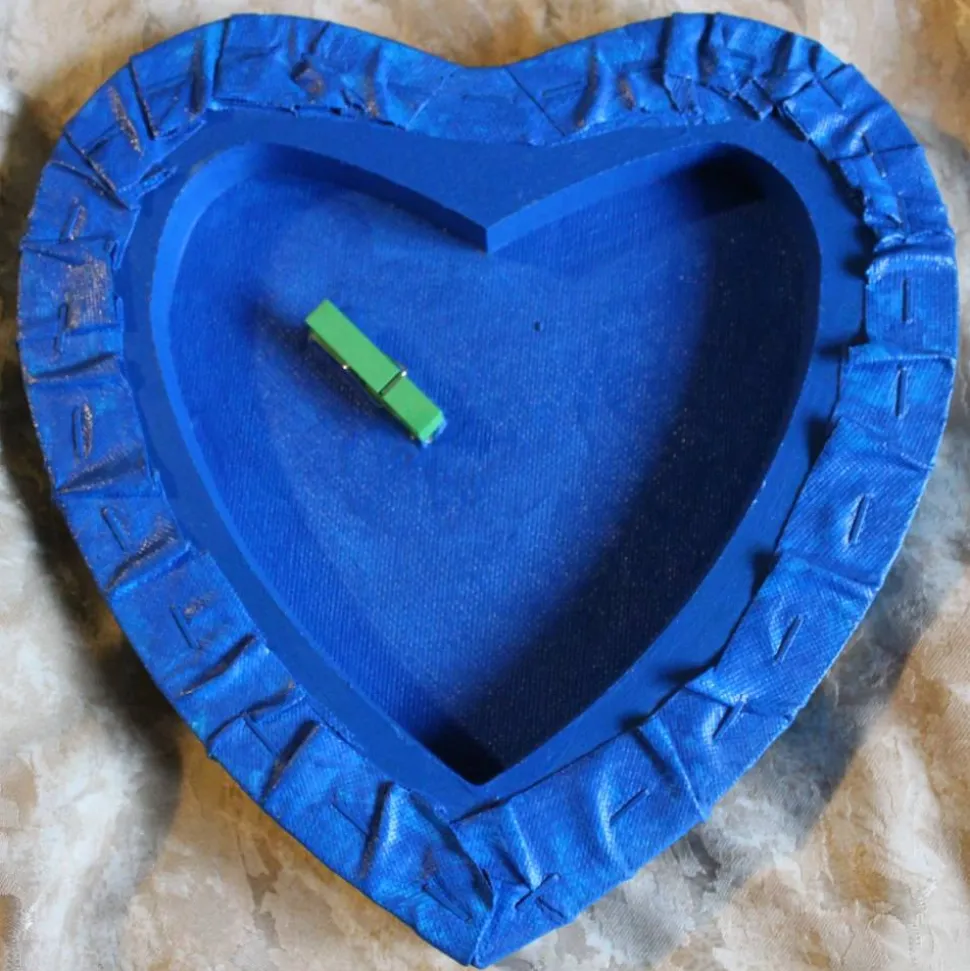 Collage, abstrakt gestaltet auf einem herzförmigen Keilrahmen.
