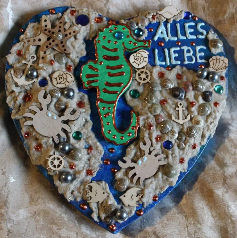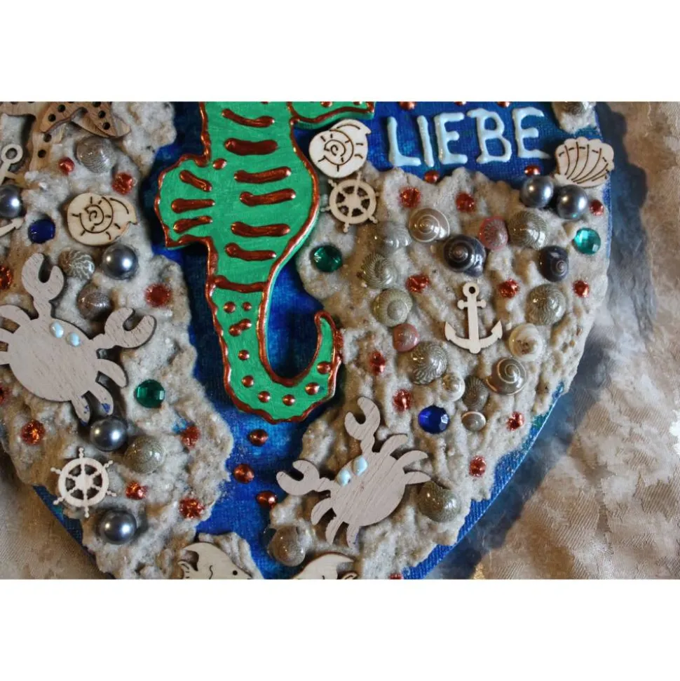 Dekoriert mit Holzornamenten, Acrylfarben, Sand, Perlen, Glitzersteinen und Muscheln.