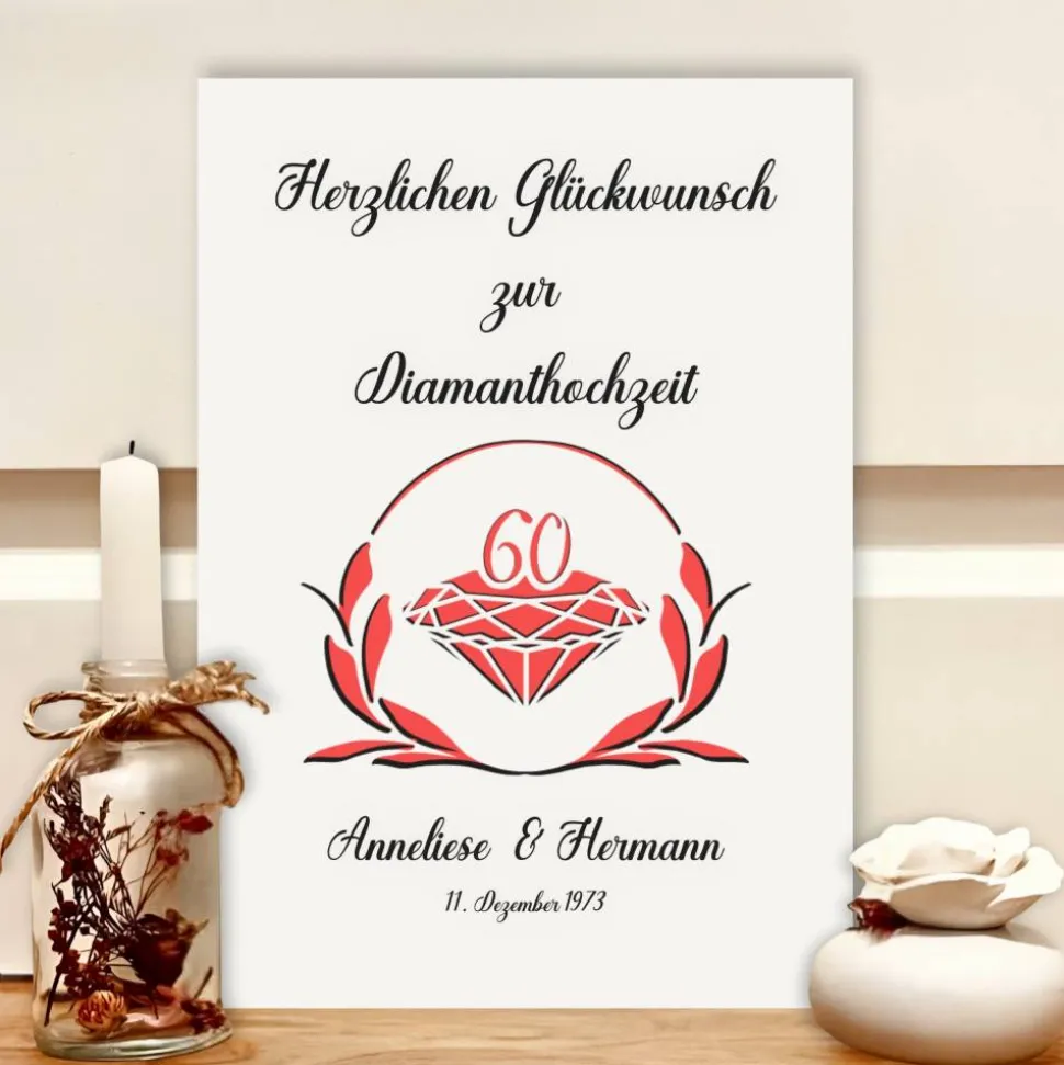 Das stilvolle A4 Bild aus 300g Strukturkarton wird mit den Namen des Jubelpaares und dem Hochzeitsdatum personalisiert. Ein aufgedruckter Diamant mit der Zahl 60 sowie der Schriftzug „Herzlichen Glückwunsch zur Diamanthochzeit“ machen dieses Präsent zu einem exklusiven Unikat.