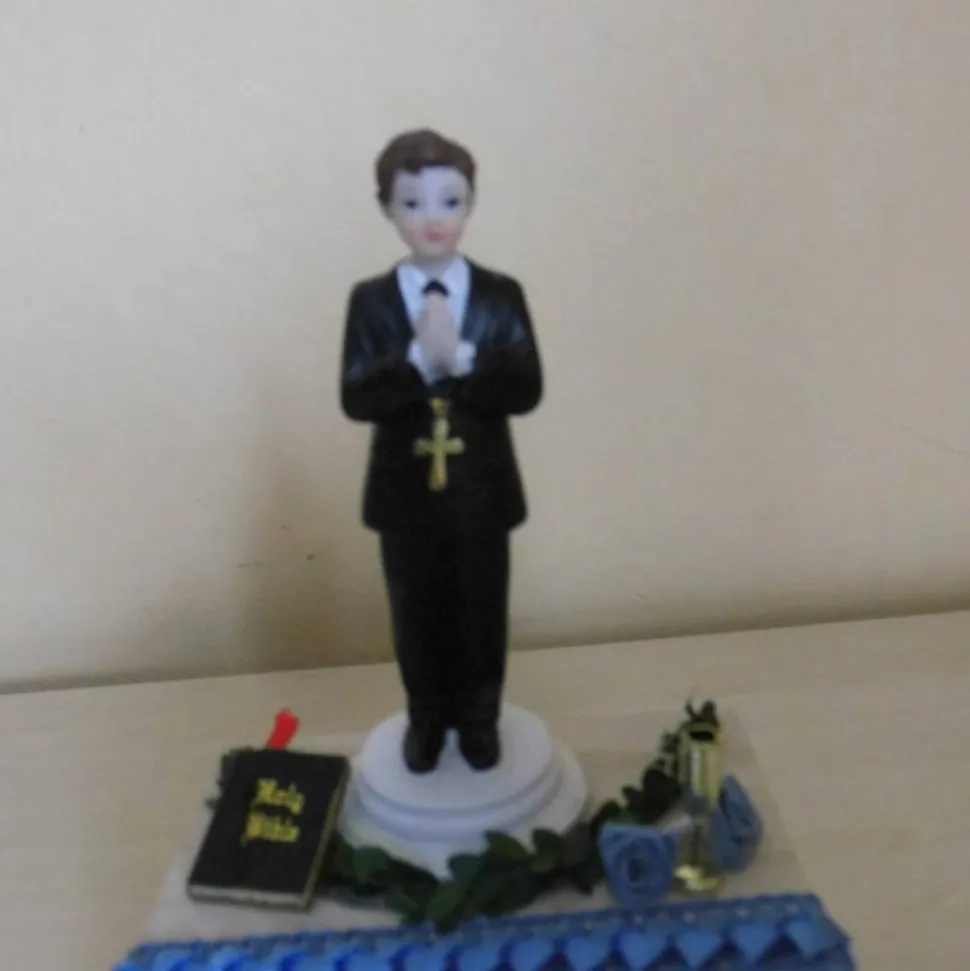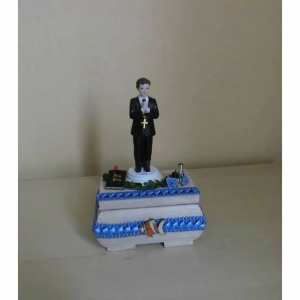 Der Hingucker dieses Geschenks ist das niedliche Kommunionkind im festlichen Anzug. Ergänzt wird die Deko durch eine Bibel, zarte Dekoblüten und einen symbolischen Fisch. Die persönliche Note: Du kannst deinen Wunschtext bei der Bestellung angeben, ich drucke ihn aus und bringe ihn direkt am Geschenk an.
