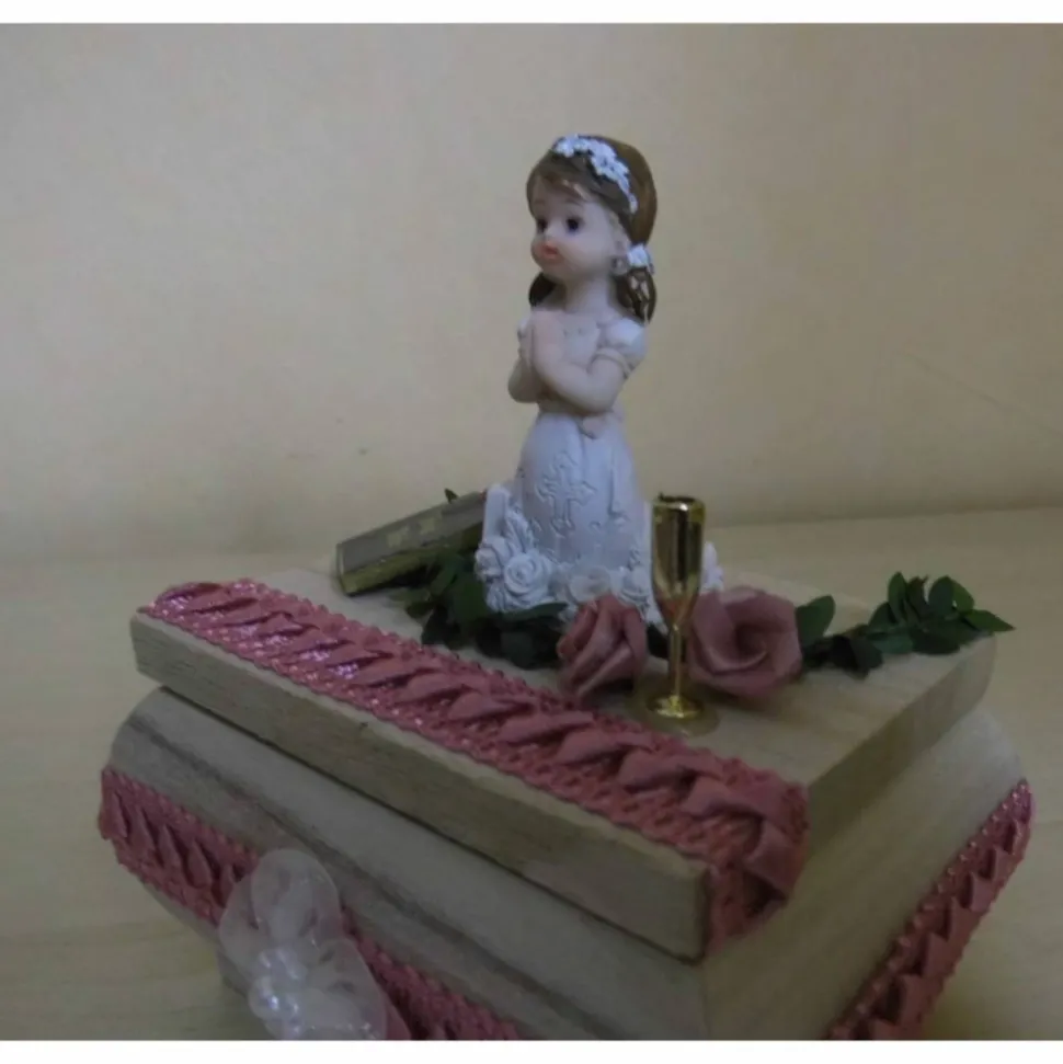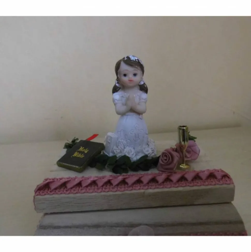 Die Box ist mit einem eleganten Band und verschiedenen Dekoelementen beklebt. Besonders ins Auge fällt das niedliche Kommunionkind im weißen Kleid. Weitere liebevolle Details wie eine kleine Bibel, dekorative Blüten und ein Fisch runden das Gesamtbild ab.