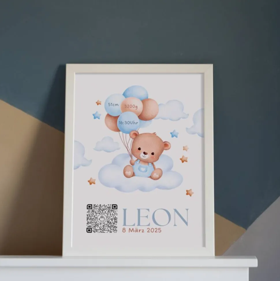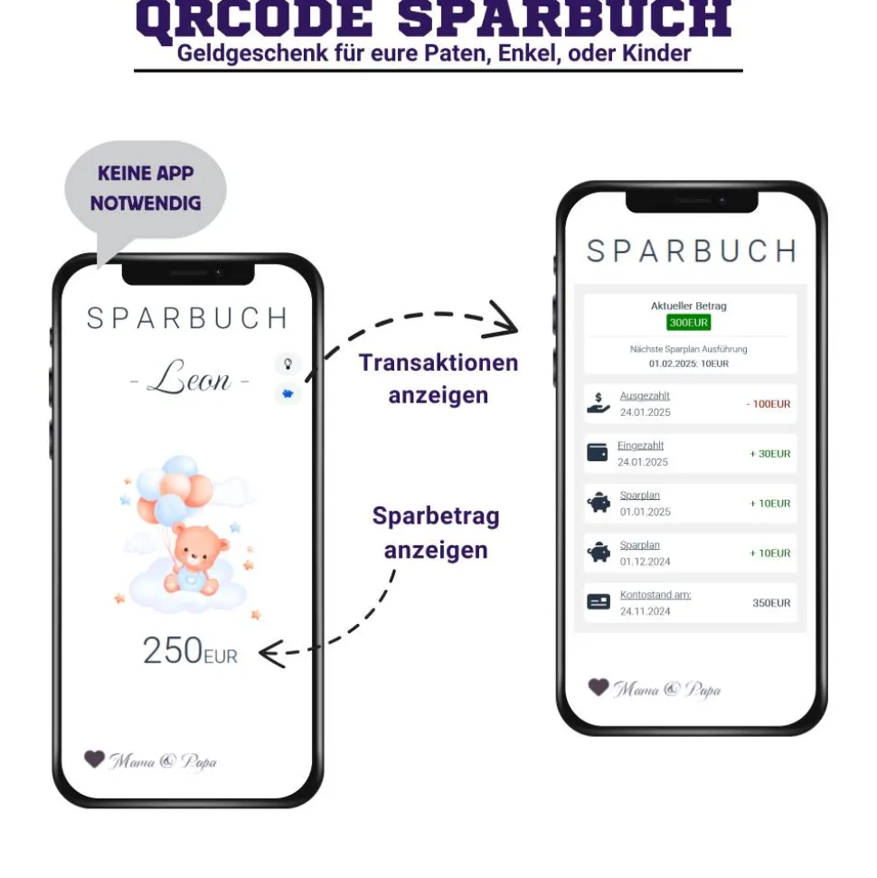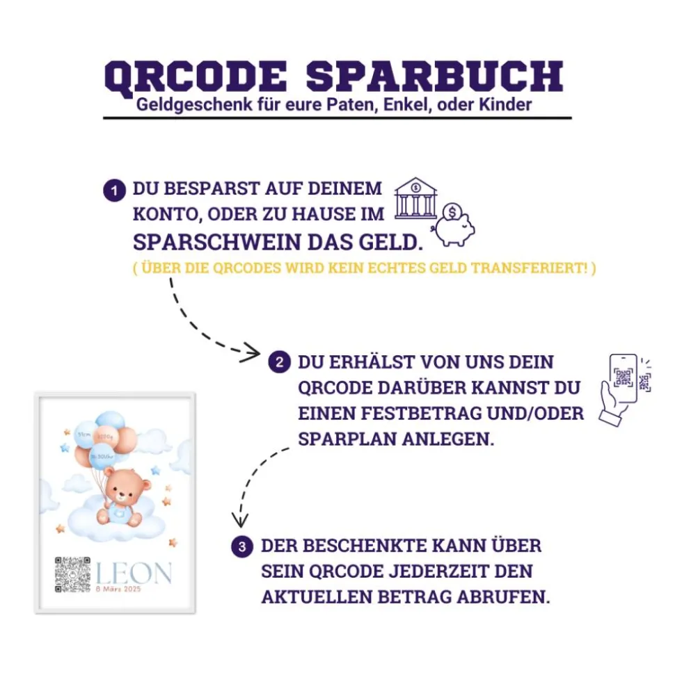 Geldgeschenk zur Geburt | Digitales Sparbuch | Personalisiertes QrCode Bild | Motiv Geburt Blau