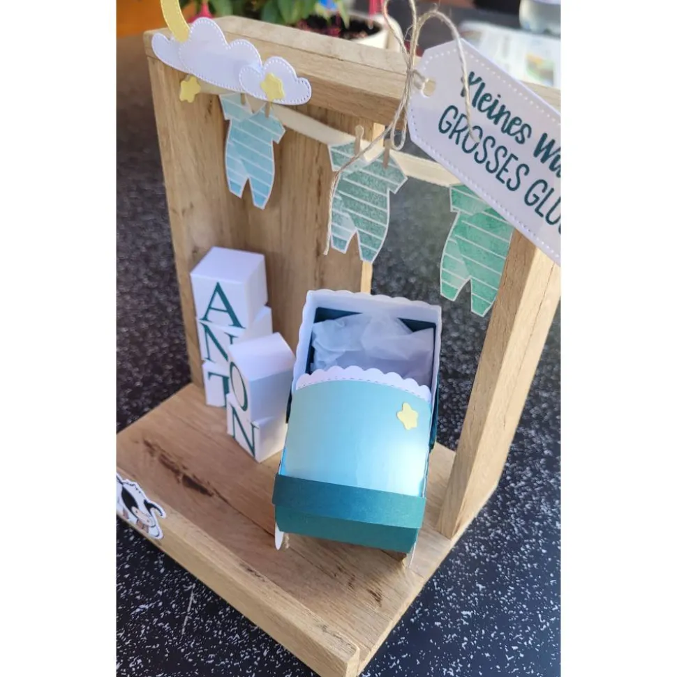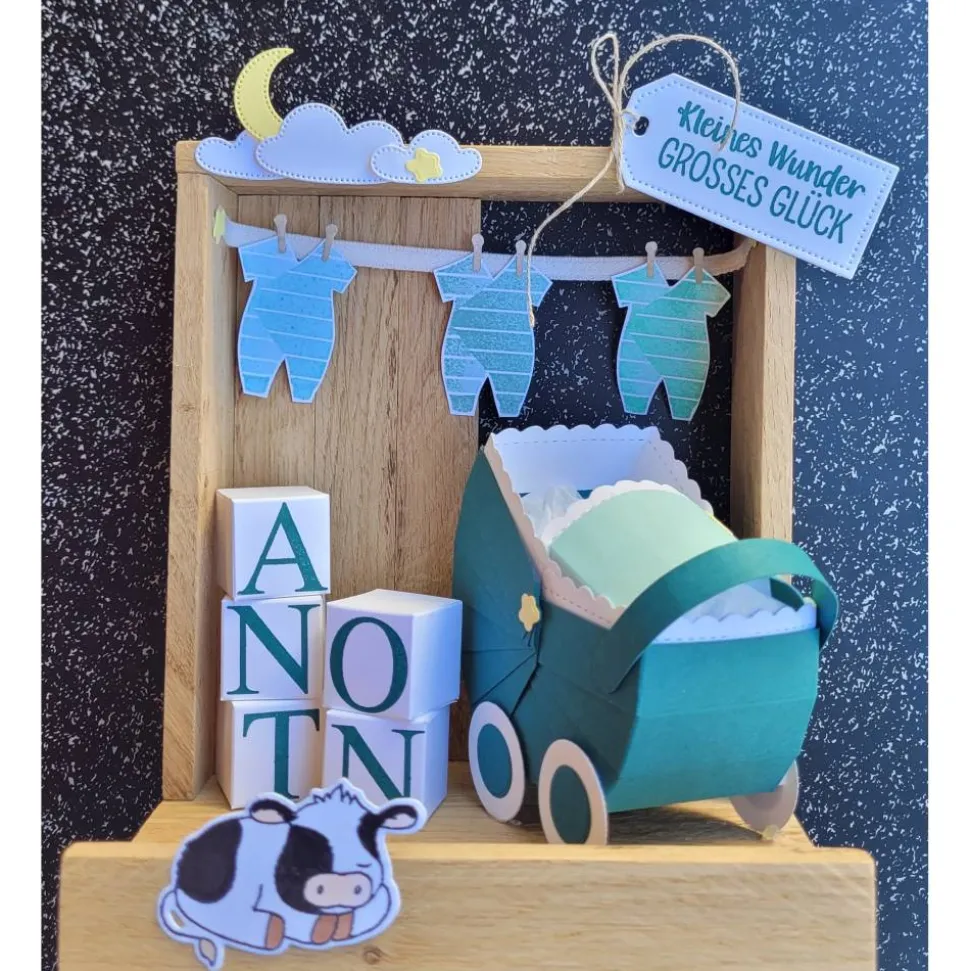 Ein Holzrahmen aus Klötzchen mit Kinderwagen in den man ein Geldgeschenk oder Geschenkkarte stecken kann. Ausdekoriert mit Stramplern, kleinen Würfeln die mit Buchstaben bestempelt sind, für den Namen des Kindes, einem Spruch und einem schlafenden Kälbchen.