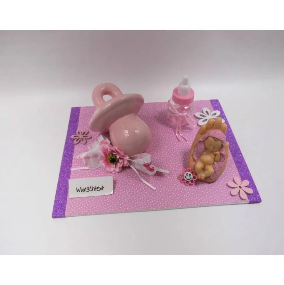 Verschenke ein einzigartiges Geldgeschenk zur Geburt, Taufe oder zum Jahrestag eines Baby Mädchens! Diese liebevoll arrangierte Szene begeistert mit einer großen Nuckelspardose, einem beschützten Baby in der Hand und liebevollen Dekoelementen. Der Spruch „Alles Liebe zum Baby !!!!!“ macht das Geschenk besonders persönlich – gerne kannst du deinen eigenen Wunschtext wählen.