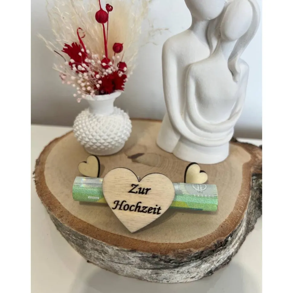 Das schöne Geldgeschenk besteht aus einer Baumscheibe und wurde mit einem Pärchen und einer Vase mit Trockenblumen verziert 🙂 Hinter dem Herz ist eine Spirale worin man das Geld hineinschieben kann.
