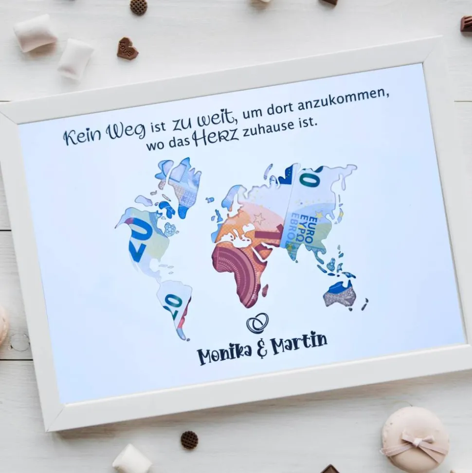 Du suchst eine besondere Möglichkeit, Geld zur Hochzeit zu verschenken? Dieses personalisierte A4-Geldgeschenk mit Weltkartenmotiv ist die perfekte Lösung! Es verbindet eine liebevolle Gestaltung mit einer eleganten Präsentation – ideal für Paare, die gerne reisen oder ihre Flitterwochen planen.