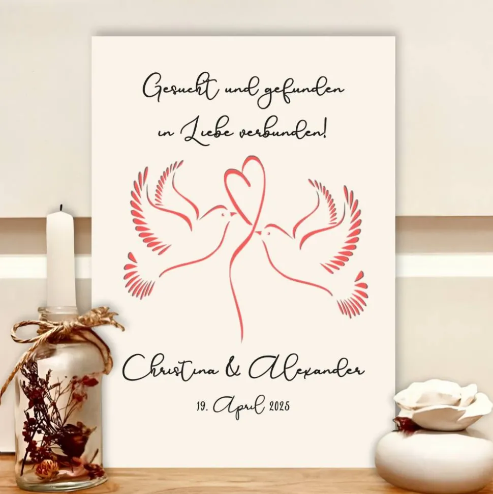Suchst du ein originelles Geldgeschenk zur Hochzeit? Überreiche dem Brautpaar ein einzigartiges, personalisiertes Geldgeschenk im Bilderrahmen, das mit den Namen des Paares und dem Hochzeitsdatum versehen wird. Der liebevolle Spruch „Gesucht und gefunden in Liebe verbunden!“ und das romantische Taubenmotiv machen dieses Präsent zu einem unvergesslichen Erinnerungsstück.