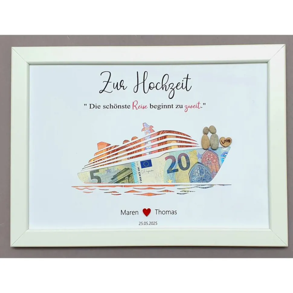 Überrasche ein Hochzeitspaar mit einem einzigartigen Geldgeschenk zur Hochzeit! Das handgefertigte Kieselsteinbild ‚Hochzeitsschiff‘ vereint persönliche Note und Exklusivität. Der hochwertige Bilderrahmen ist eine bleibende Erinnerung und eignet sich ideal als Hochzeitsgeschenk für Reisen, Kreuzfahrt oder Flitterwochen.
