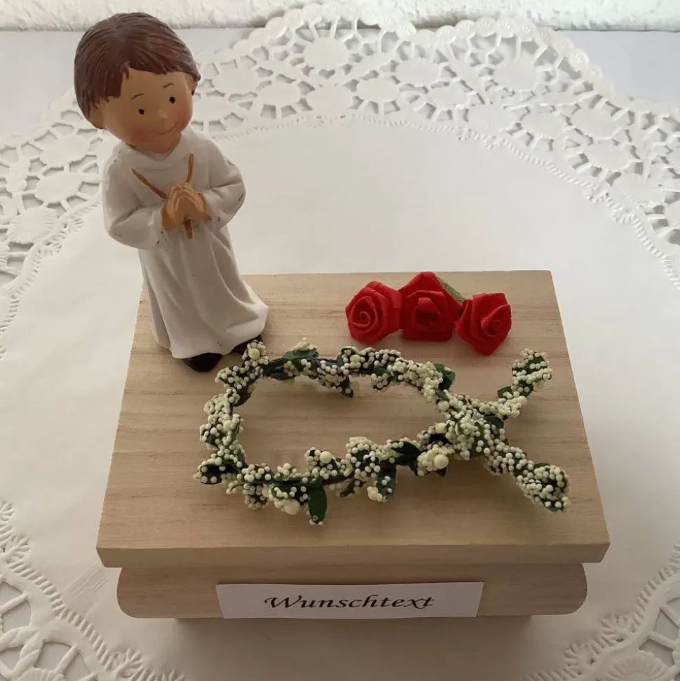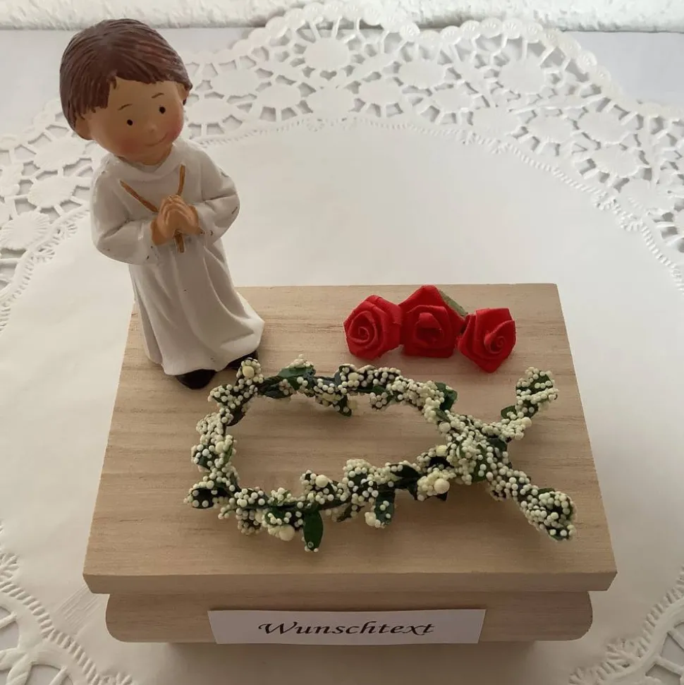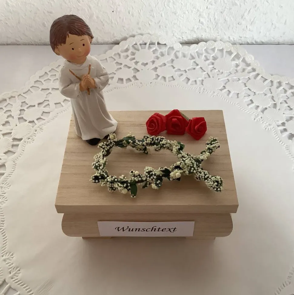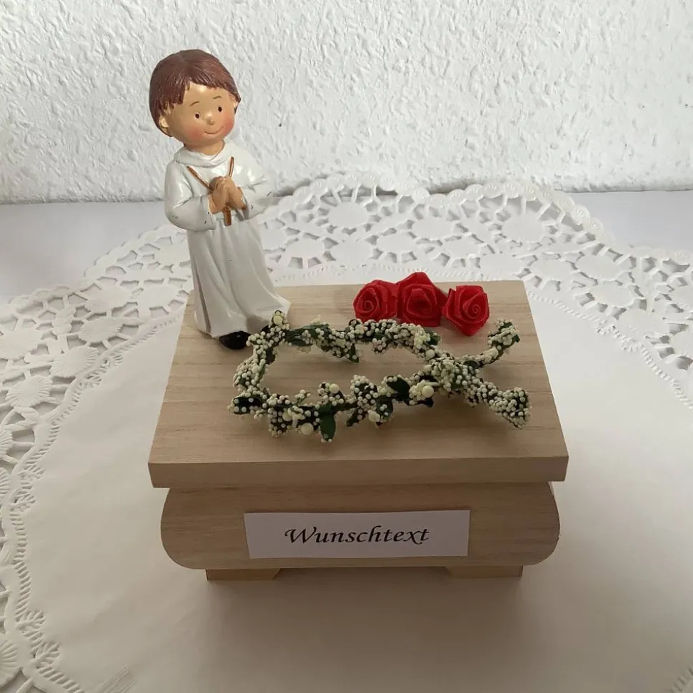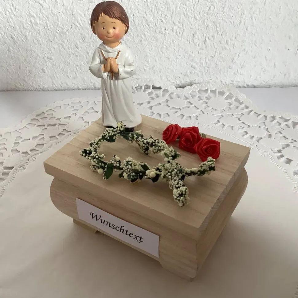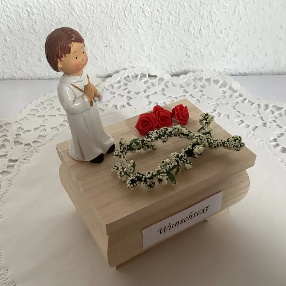 Ein tolles Highlight: in der praktischen Holzbox können besondere Erinnerungsstücke an die Kommunion oder Firmung verwahrt werden.