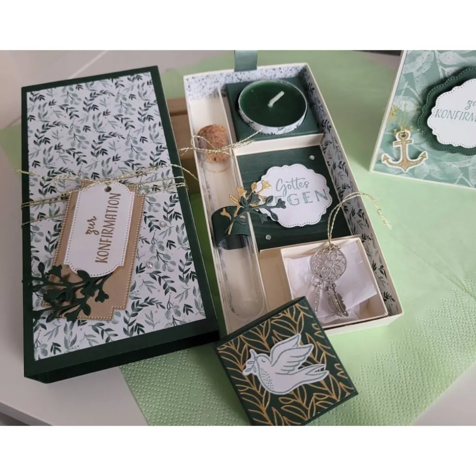 Eine Geschenkschachtel mit einem Reagenzglas für das Geldgeschenk, einem farblich passenden Teelichteine und einer kleinen Schachtel mit einem kleinen Anhänger (Traumfänger).