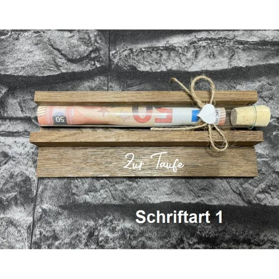 Geldgeschenk • Zur Taufe • Reagenzglas • Geschenkverpackung aus Holz • Räuchereiche • Klötzchen