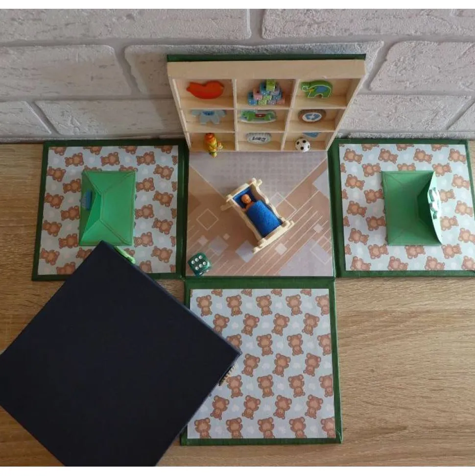 Holzregal mit Spielzeug und Verzierungen