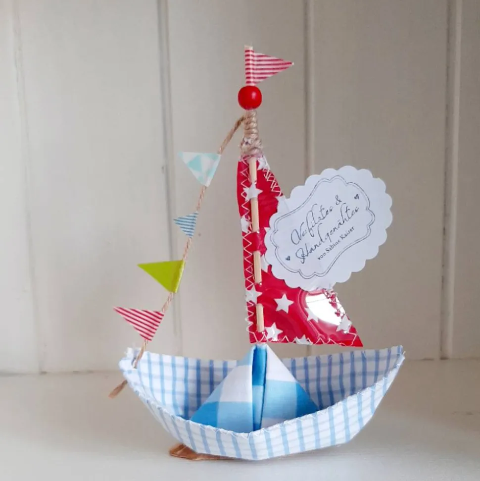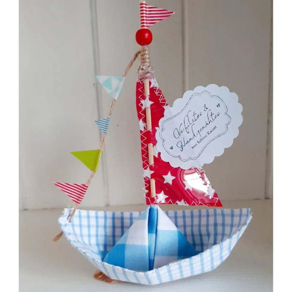 Das hier ist nicht aus Papier, sondern aus Stoff und hat noch einen Mast, ein Segel und eine kleine bunte Wimpel Girlande, aber es erinnert einen trotzdem an die kleinen Schiffchen aus Kindertagen.