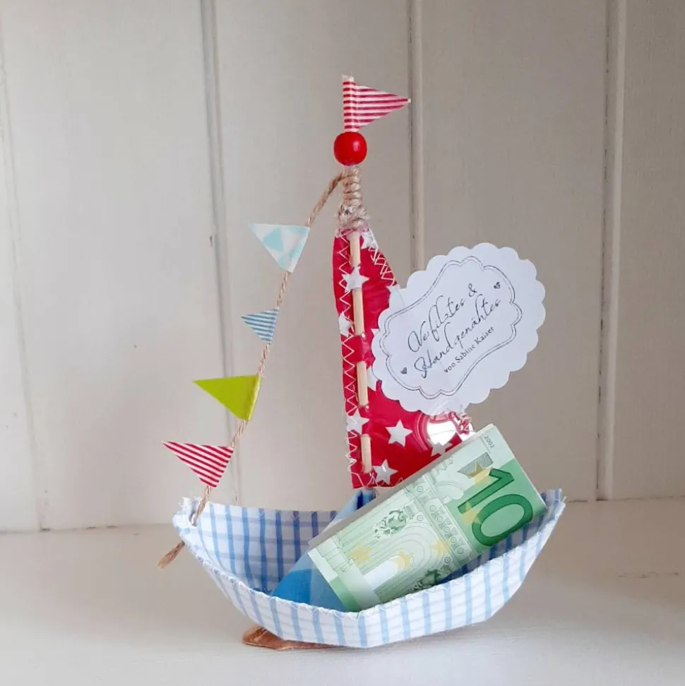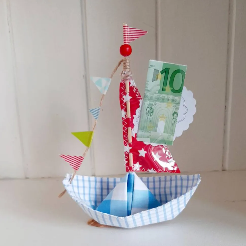 Den Geldschein steckst Du dafür einfach seitlich in das doppel-lagige Segel oder legst ihn in das Boot und fertig.