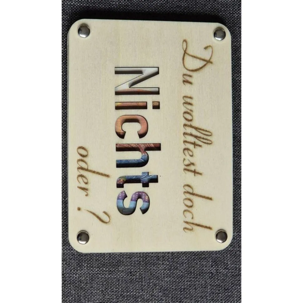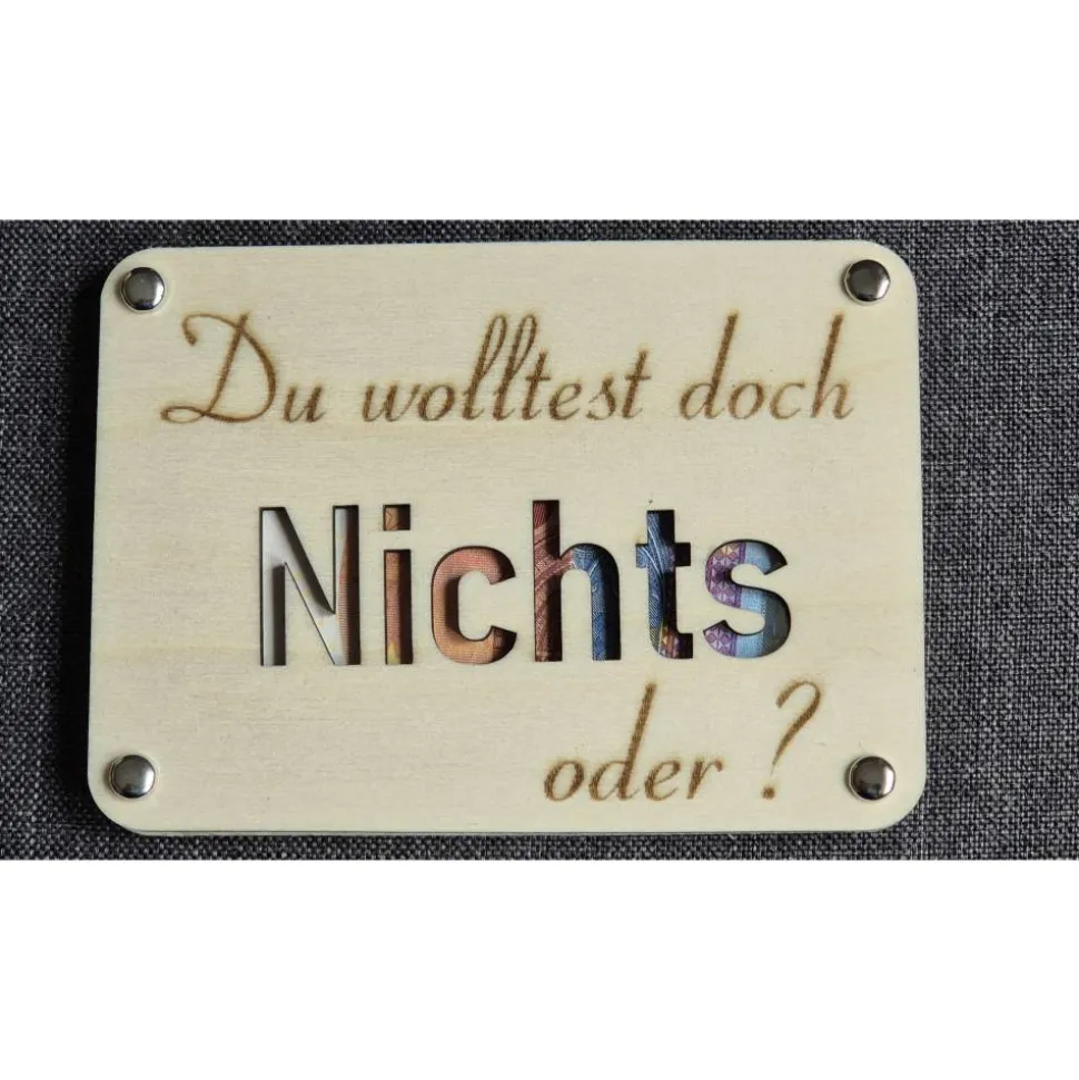 Entdecke die originelle Geldkarte aus Holz – das perfekte Geldgeschenk für Geburtstag, Taufe, Jubiläum, Hochzeit, Einweihung und viele weitere Anlässe. Die hochwertige Karte besteht aus zwei Teilen aus 3mm Bastelholz und bietet Platz für Geldscheine, die durch das präzise ausgelaserte Wort NICHTS sichtbar werden.