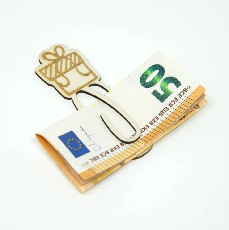 Du weißt nicht, wie du deinen Freunden oder Verwandten „nur“ Geld schenken kannst? Hier ist die Lösung! Unsere Geldspange aus Holz macht aus einem simplen Geldschein ein individuelles und stilvolles Präsent. Damit wird dein Geschenk nicht nur wertvoll, sondern auch einzigartig.