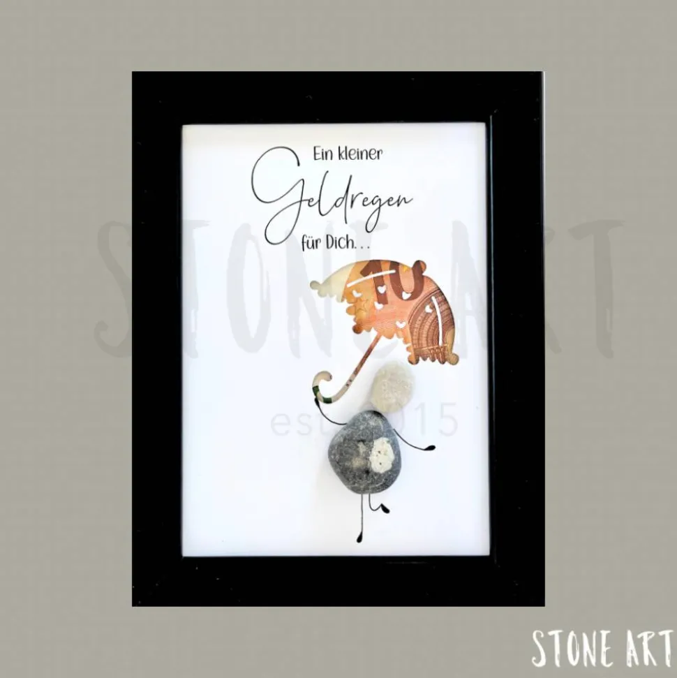 Überrasche mit dem handgefertigten Geldregen Steinbild – das originelle Geldgeschenk für jeden Anlass! Die detailreiche Kieselsteinfigur hält einen Regenschirm und lädt den symbolischen Geldregen ein. Dieses Steinbild steht für Glück, Wohlstand und die besten Wünsche und macht dein Geldgeschenk zum absoluten Highlight.