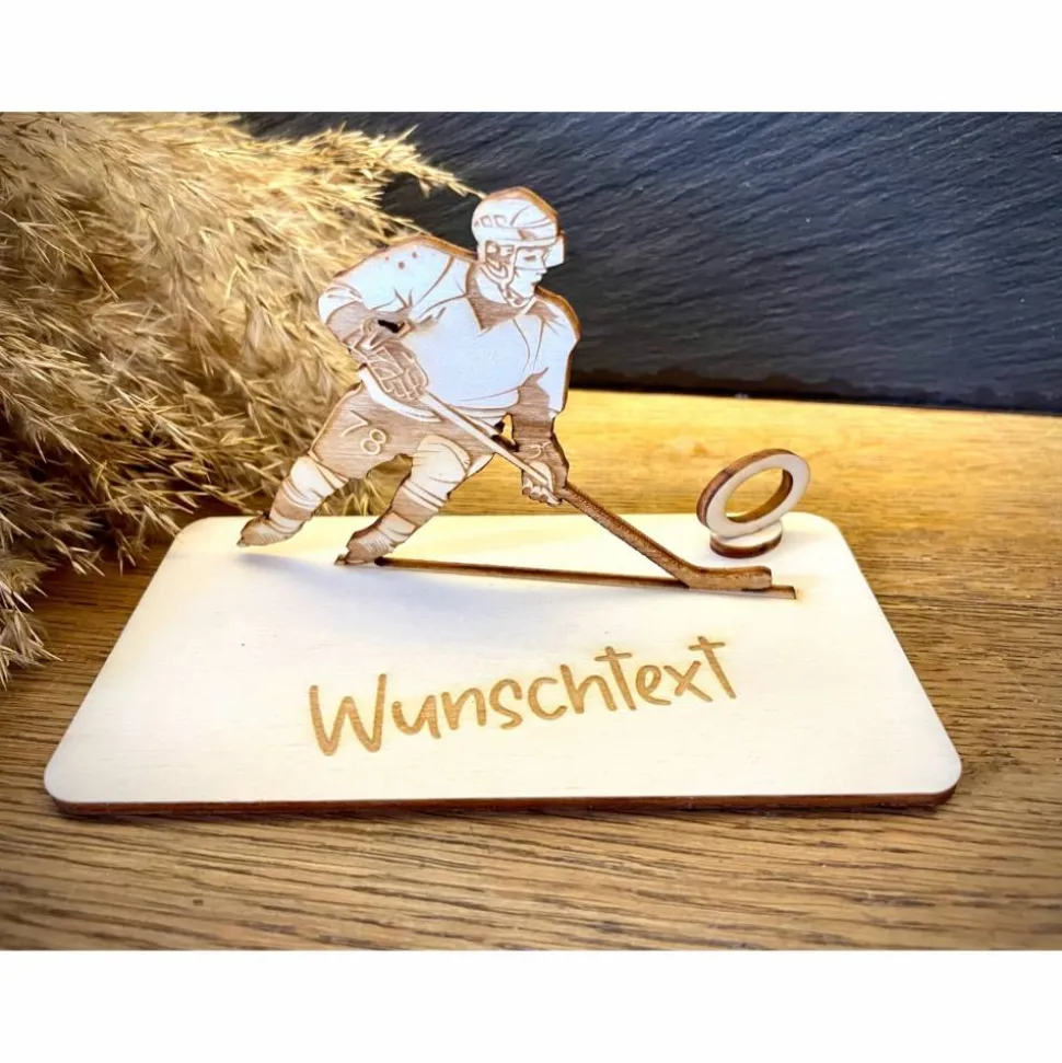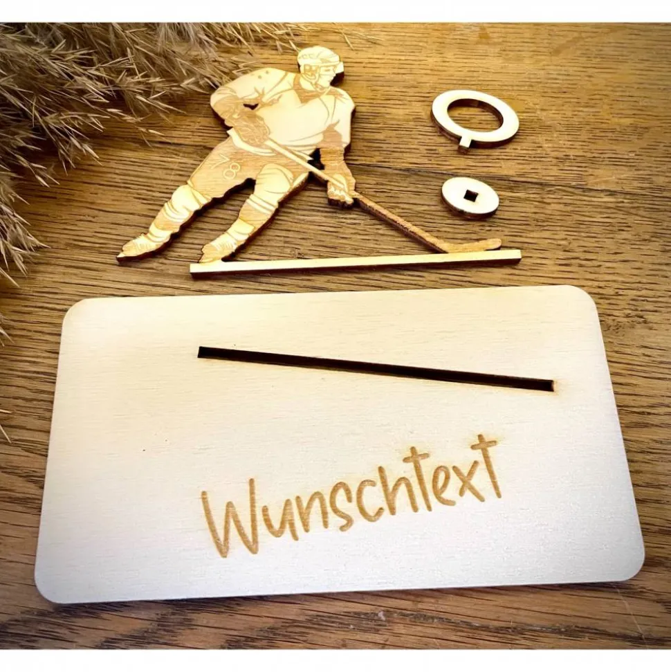 Für alle Eishockeyfans! Dieses aus Holz gefertigte Geschenk mit Eishockeyspieler ist eine originelle Möglichkeit, einen Geldschein zu verschenken. Perfekt für sportliche Anlässe oder kleine Überraschungen zwischendurch. Mit Liebe zum Detail gestaltet, bringt es die Leidenschaft fürs Spiel auf charmante Weise zum Ausdruck.