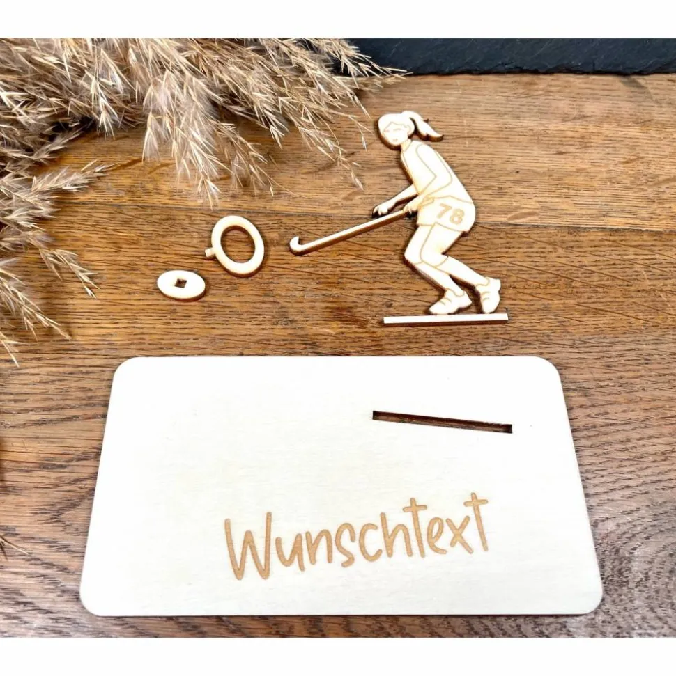 Für leidenschaftliche Hockeyspielerinnen! Diese aus Holz gefertigte Feldhockeyspielerin ist eine originelle und liebevolle Möglichkeit, einen Geldschein zu verschenken. Mit viel Liebe zum Detail gestaltet, zeigt sie Teamgeist und Sportleidenschaft. Ein besonderes Geschenk für Spielerinnen, Fans oder Trainerinnen – kreativ, sportlich und mit Herz.