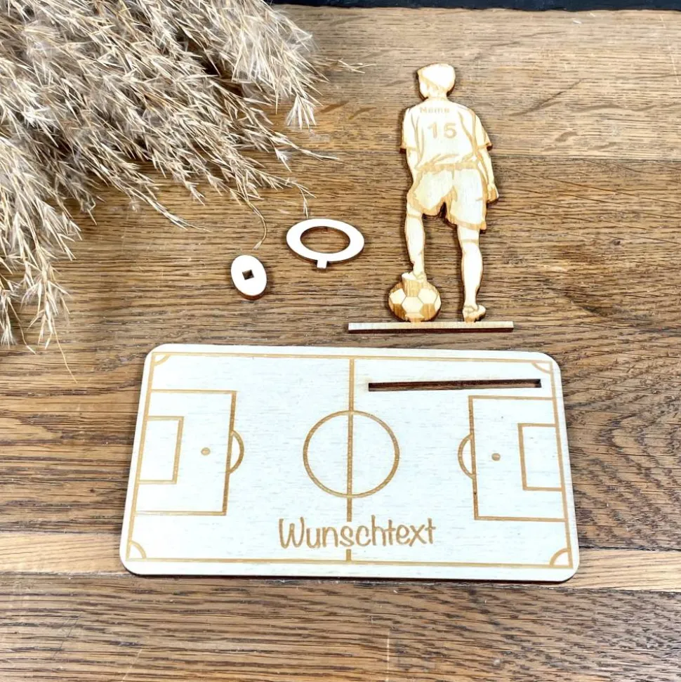 Für echte Fußballfans! Dieser aus Holz gefertigte Fußballspieler ist eine originelle Möglichkeit, einen Geldschein sportlich zu verschenken. Das Highlight: Die Trikotnummer ist personalisierbar und macht Dein Geschenk einzigartig. Liebevoll gestaltet und mit viel Detail, eignet sich dieses Präsent perfekt für Spieler, Fans oder besondere Fußballmomente.